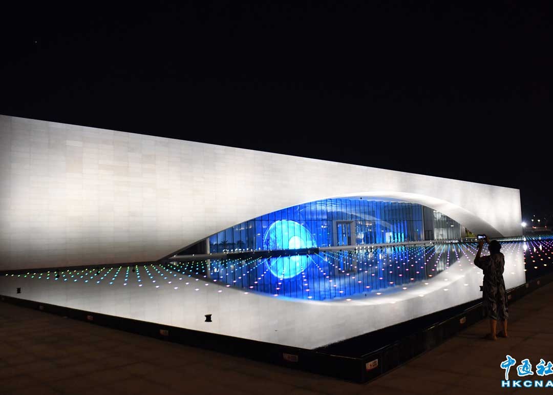 5月16日晚,“雄安之眼”——雄安城市計算中心前,民眾前來拍照打卡。近日,雄安城市計算中心燈光亮起,建築的拱形東立面與湖景水面中的倒影光影融合,共同構成了“雄安之眼”。香港中通社圖片