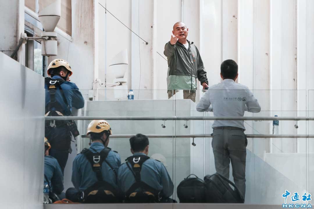 5月19日中午,一名男子站在香港沙田新城市廣場7樓中庭高處危險位置,情緒激動落淚。警方及消防員接報到場,疏散地面途人,並開氣墊戒備,隨後談判專家到達現場,了解其訴求及展開遊說。(香港中通社記者 謝光磊攝)