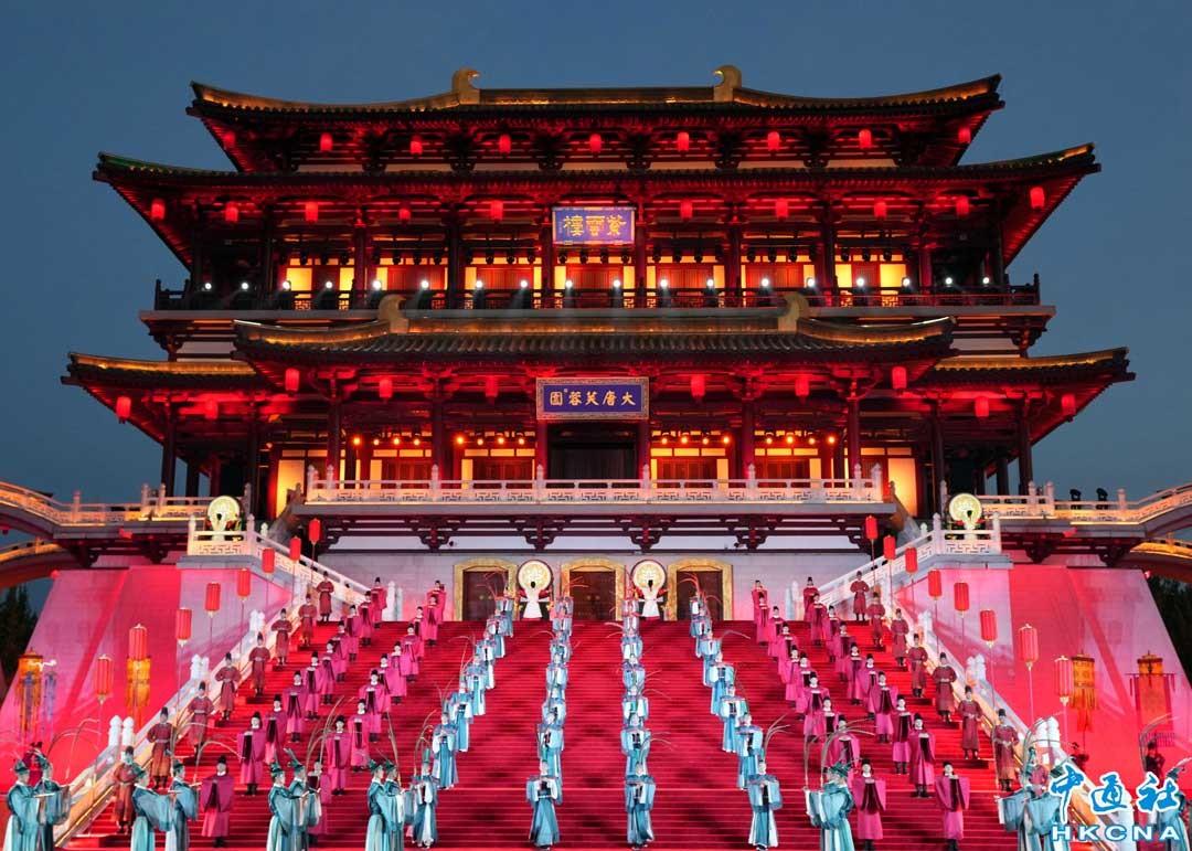 5月18日晚,演員在陝西省西安市大唐芙蓉園舉行的歡迎儀式上表演,迎接出席中國-中亞峰會的貴賓。 香港中通社圖片