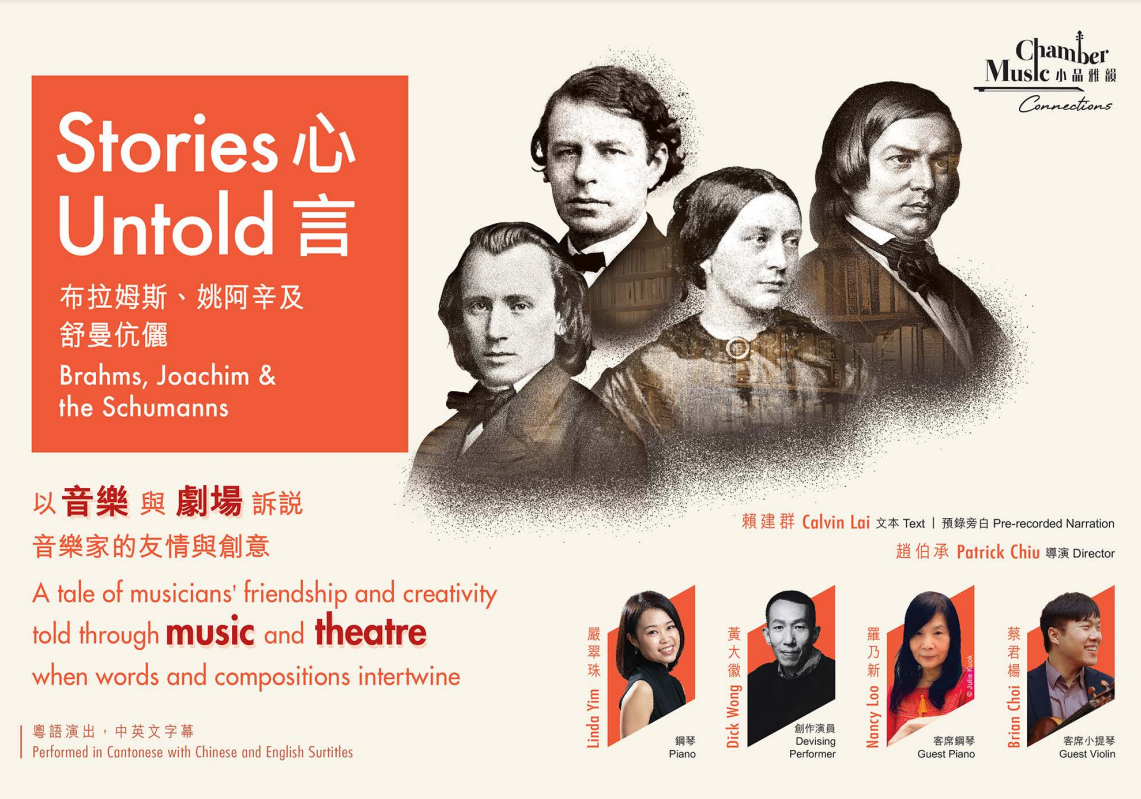 圖片來源:香港政府新聞處 本劇講述姚阿辛在整理舊信件時,回想起昔日與好友克拉拉.舒曼、羅拔.舒曼和布拉姆斯相交的軼事,彼此在音樂創作路上交流和鼓勵的美好日子。劇場透過現場演奏四位音樂家的美妙樂章、預錄的旁白和創作演員的即場演繹作串連,向觀眾娓娓道出四人相遇相知的友情故事。 這次節目由本地鋼琴家嚴翠珠、音樂教育工作者賴建群和獨立製作人游慧姿策劃,賴建群同時負責編寫全新文本及預錄旁白,導演為趙伯承。嚴翠珠(鋼琴)、黃大徽(創作演員)、羅乃新(客席鋼琴)和蔡君楊(客席小提琴)作即場演出。(完) 【編輯:崔靜雯】