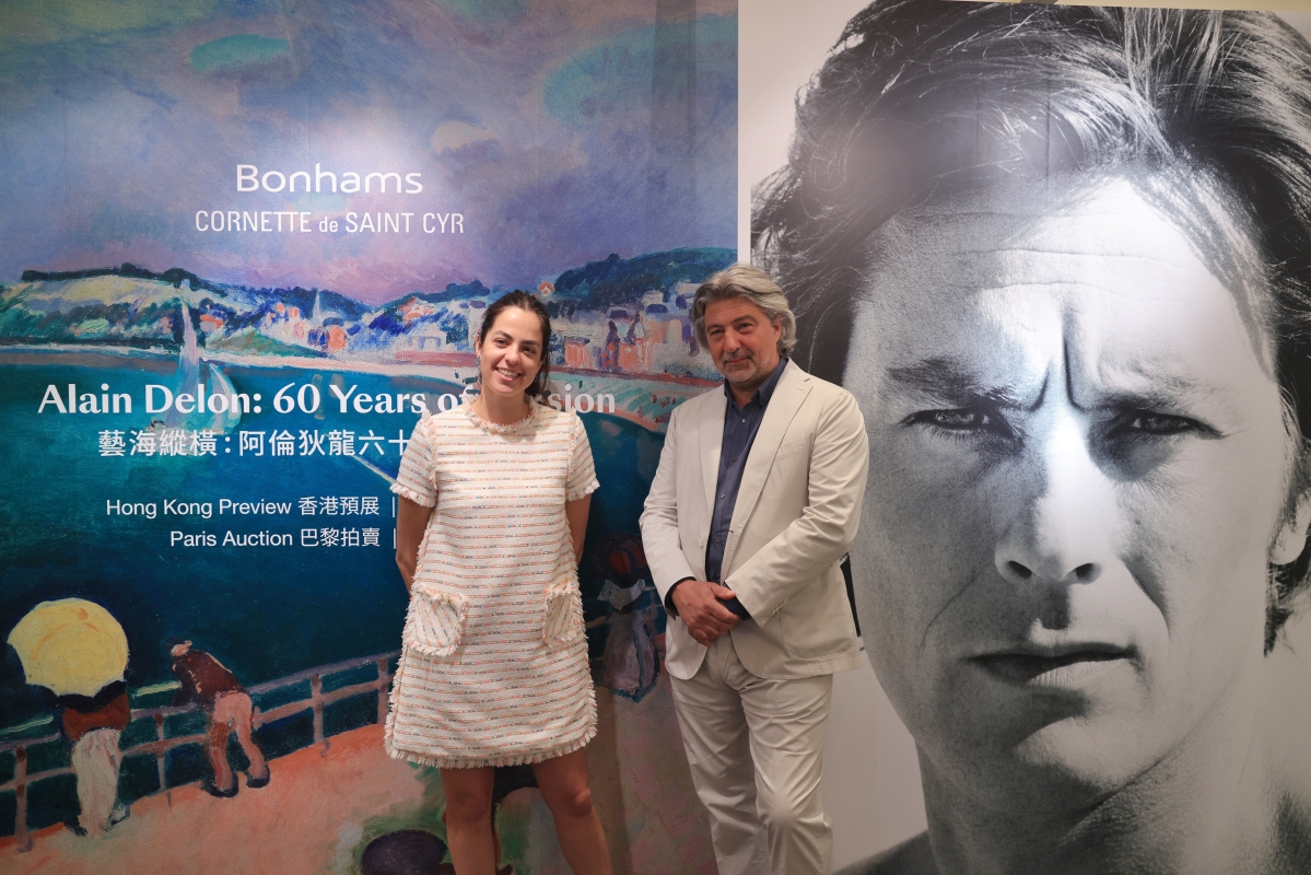阿倫·狄龍的女兒阿努什卡(左)和巴黎邦瀚斯行政總裁Arnaud Cornette de Saint Cyr 阿倫·狄龍的女兒阿努什卡介紹藏品《豹怒吼》