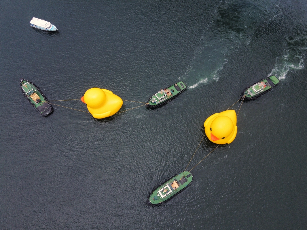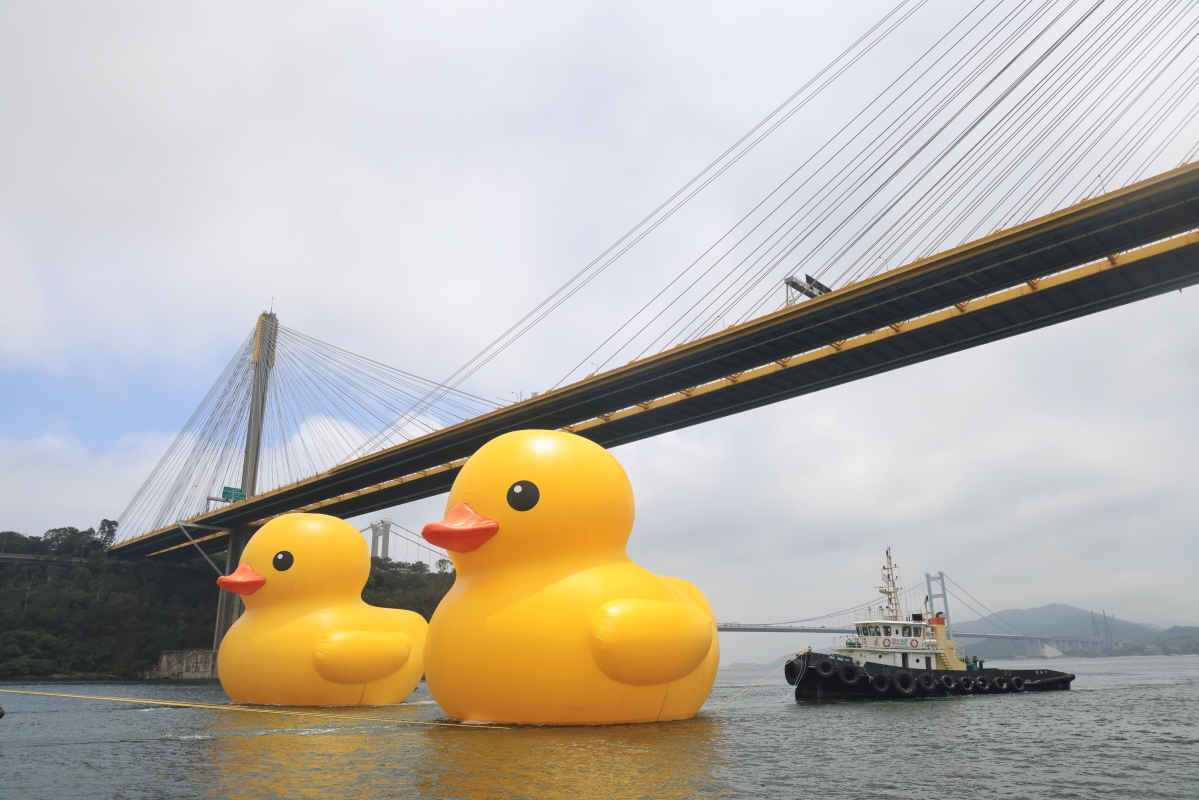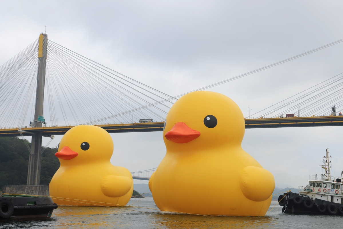 香港新聞網5月25日電(記者 許其皓)5月25日,一對高18米的巨型黃色橡皮鴨現身香港青衣海域試水。由荷蘭藝術家霍夫曼(Florentijn Hofman)創作的巨型橡皮鴨,高 18 米,是全球最高的橡皮鴨之一,自2007年起遨“游”世界各地,2013年《橡皮鴨游世界·香港站》由創意品牌 AllRightsReserved(ARR)策展,在當時吸引了大批市民旅客親臨維港打卡。今年適逢橡皮鴨訪港10周年,AllRightsReserved 邀請橡皮鴨再次來港,橡皮鴨首度夥拍同伴再次來港,齊齊現身大型海上公共藝術展覽《橡皮鴨二重暢》。《橡皮鴨二重暢》主辦單位將於6月1日正式公佈有關詳情。
