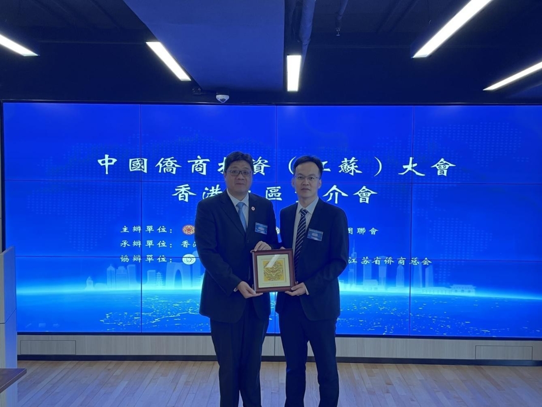 江蘇省僑聯副主席陳峰(右一)致送紀念品予香港僑界社團聯會,由該會會長黃楚基(左一)代表接受。 這次江蘇大會亦很注重質方面的提升,通過加強調查研究,深入了解僑界所思所想、所期所盼,辦實事、解民憂,妥善處理涉僑法律法規的宣傳實施、維護歸僑僑眷和海外僑胞在國內的合法權益等各項為僑服務工作,妥善解決僑胞的急難愁盼問題,著力增強僑商和僑胞的獲得感、幸福感、安全感。 中國僑商投資大會是中國僑聯打造的重要品牌,旨在為廣大僑胞和地方政府搭建合作共贏的平台,為新時代新征程構建新發展格局、實現高質量發展匯聚僑界力量。黃會長認爲第三屆中國僑商投資大會安排在江蘇舉行是非常合適, 因其坐落長三角的優越地理位置及擁有豐富的天然資源;三千多年來江蘇不論在文化、經濟、營商都處於中國前列。 江蘇省僑聯副主席陳峰表示,江蘇省是一帶一路的東方橋頭堡,同時更是經濟科技大省及創新創業的熱土,在新技術新產業新業態的發展上獨具優勢, 與香港擁有重要的聯繋。該省現正積極引資引才。他歡迎香港企業家親身到南京、揚州體驗營商環境。 揚州市僑聯副主席周軍說,揚州產業興旺,是一座活力湧動的科創城市, 現在更全力打造成爲文化旅遊及生態宜居名城;並以中國式現代化推進揚州的發展。揚州的領先行業包括汽車、汽車零部件及高端裝備等。 南京市僑聯聯誼聯絡部部長陳志軍歡迎香港年青的科創企業家到南京考察半導體、晶片、人工智能、生命科學和軌道交通等產業。他指出南京擁有穩固的技術人才基礎,及高效、專業的商業環境。(完) 【編輯:崔靜雯】