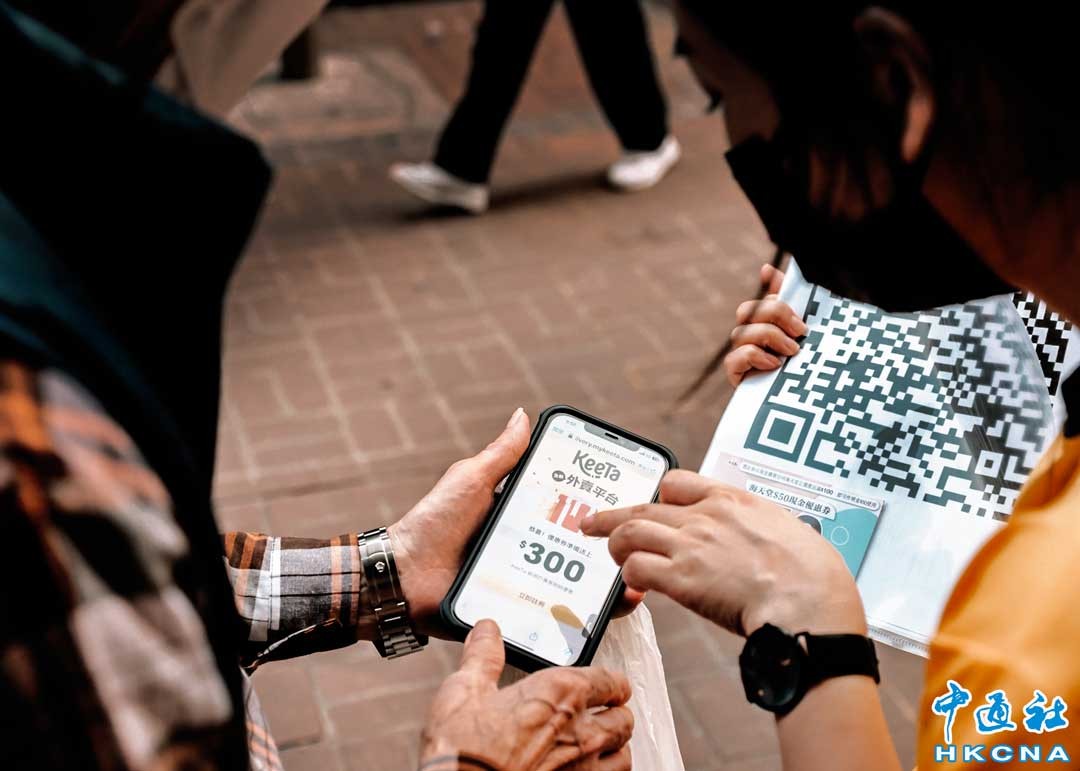 5月22日,美團旗下全新外賣品牌KeeTa正式在香港啟動送餐服務,旺角及大角咀為首階段試點;其後將逐步拓展至其他區域,預計年底覆蓋整個香港。每位註冊新用戶將獲價值300港元優惠券。圖為KeeTa工作人員協助顧客註冊軟件及領取優惠券。 (香港中通社記者 謝光磊攝)