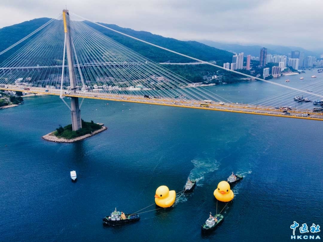 5月25日,一對高18米的巨型黃色橡皮鴨現身香港青衣海域試水。由荷蘭藝術家霍夫曼(Florentijn Hofman)創作的巨型橡皮鴨,自2007年起遨“游”世界各地,2013年《橡皮鴨游世界·香港站》吸引了大批市民旅客親臨維港打卡。今年適逢橡皮鴨訪港10周年,橡皮鴨首度夥拍同伴再次來港,齊齊現身大型海上公共藝術展覽《橡皮鴨二重暢》。(香港中通社記者 許其皓攝)