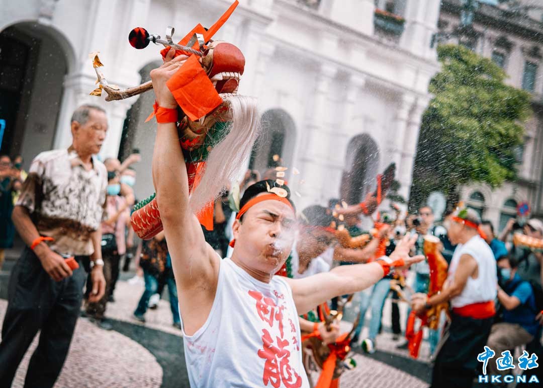 5月26日,醉龍節隊伍在“魚行醉龍節2023”上表演。當日,由澳門鮮魚行總會主辦的“魚行醉龍節2023”於三街會館前開幕,醉龍醒獅表演助興,場面盛大,同賀佛誕。 “魚行醉龍節”是澳門獨有的一項民間傳統節慶活動,於2009年列入《澳門非物質文化遺產預備名錄》,及後於2011年正式入選《國家級非物質文化遺產名錄》。香港中通社圖片
