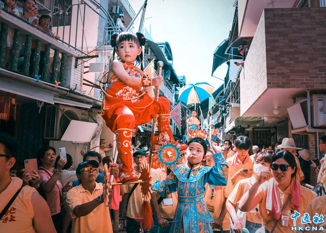 5月26日是農曆四月初八佛誕日,香港長洲舉行太平清醮會景巡遊,吸引了大批市民和遊客前來觀看。今年共有8支各具特色的隊伍參加巡遊,各隊伍派出飄色、醒獅、金龍、麒麟、樂隊和潮州大鑼鼓等,沿主要街道巡行。所謂“飄色”,是由小孩扮演不同的生活角色,他們坐在巡遊車上,配以別具特色的服飾,看起來就像飄了起來一樣。圖為小朋友打扮成神話人物“哪吒”參加巡遊。(香港中通社記者 許其皓攝)