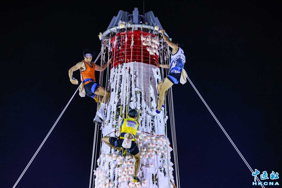 5月27日0時,香港“包山嘉年華2023”壓軸項目“搶包山決賽”在長洲舉行。圖為接力邀請賽決賽。(香港中通社記者 許其皓攝)