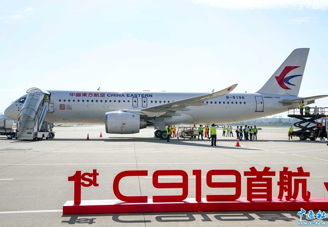 5月28日上午,中國東方航空使用中國商飛全球首架交付的C919大型客機,執行MU9191航班,從上海虹橋機場飛往北京首都機場,航班搭載130餘名旅客。圖為C919大型客機在虹橋機場停機坪上待客。 香港中通社圖片