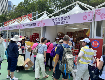 (重慶展位剛開放就吸引大批市民駐足購買) 開幕當天,位於O區01號的“香港重慶總會-重慶麻辣印象”展位就門庭若市,來自重慶的特色美食琳瑯滿目,重慶小麵、怪味胡豆、手工麻花、酸辣粉等商品,現場售價僅在10至20港元之間,獲吸引大批愛吃辣的港人駐足購買。