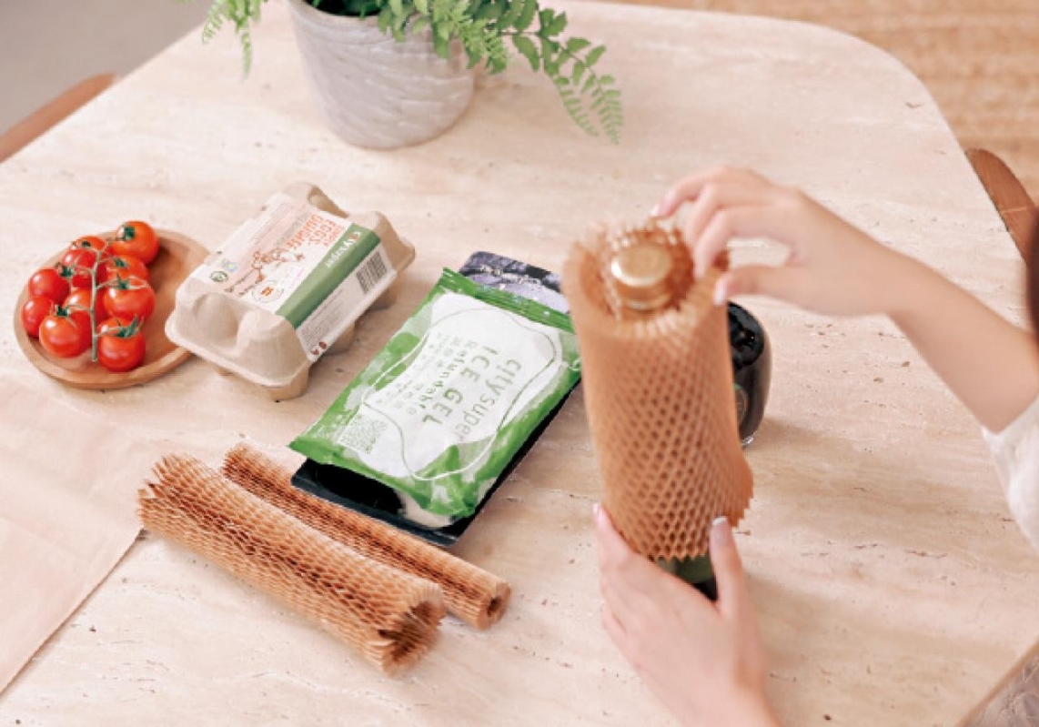 圖為環保蜂巢紙,可取代氣泡膠膜包裝易碎品。另枱上是city'super供出借的可重用環保冷劑,歸還後可取回5元按金。