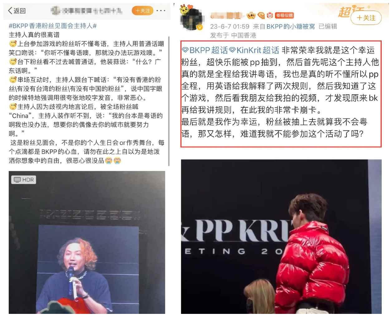 泰國人氣組合BKPP6月6日晚在香港九龍灣國際展貿中心舉行香港粉絲見面會,誰料卻發生不和諧一幕。 據港媒報道,該見面會的主持人疑似“黃絲”,故意把中國和台灣地區、香港地區並列而論。 為此,台下粉絲大喊:“台灣是中國的!” 但主持人卻當做沒聽到、聽不懂的樣子。 於是,現場立刻出現了這樣的名場面——“CHINA CHINA CHINA CHINA……”粉絲的聲音響徹整個場館。 除疑似混淆國家和地區名字外,據網友爆料,該主持人及現場翻譯者等人,在舞台上還屢次出現疑似歧視中國大陸粉絲的話語及行為。 比如,主持人在登場後,隨即問台下有沒有台灣人和香港人,接著便故意拖長音,一臉鄙夷地問:“有沒有中國人啊?” 在遊戲環節,該主持人見內地粉絲被抽中,就故意各種刁難她,全程用粵語介紹遊戲規則。最後連BKPP成員都看不下去了,一度繞開主持人,自己上前用英語跟粉絲交流。
