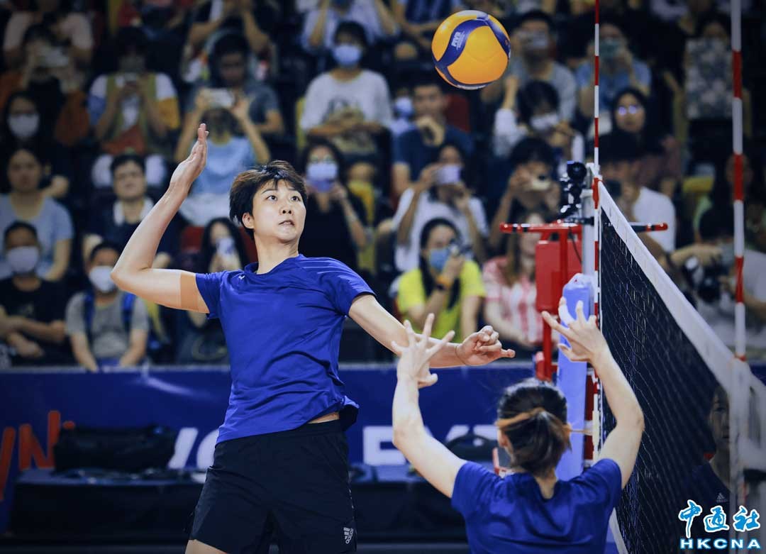 6月10日,“賽馬會社區排球計劃:中國女排全接觸”活動在香港體育館舉行,市民近距離在紅館觀摩中國國家女子排球隊練習實況,並邀請中國女排隊員與香港青年學生進行技術交流。圖為中國女排隊長袁心玥在訓練中扣球。 (香港中通社記者 許其皓攝)