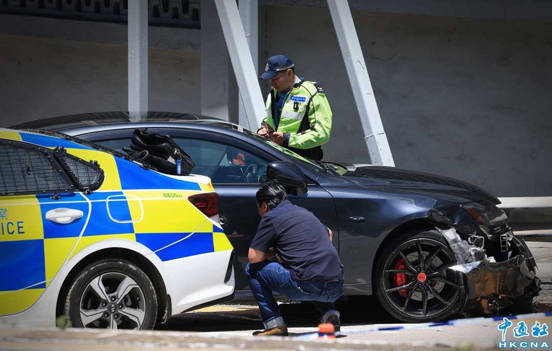6月10日,警員在檢查涉事車輛。當天中午警方在紅磡調查可疑車輛期間,一輛私家車撞向警車,兩名警員各開一槍,無擊中目標,警方隨後拘捕一名男子。 (香港中通社記者 許其皓攝)