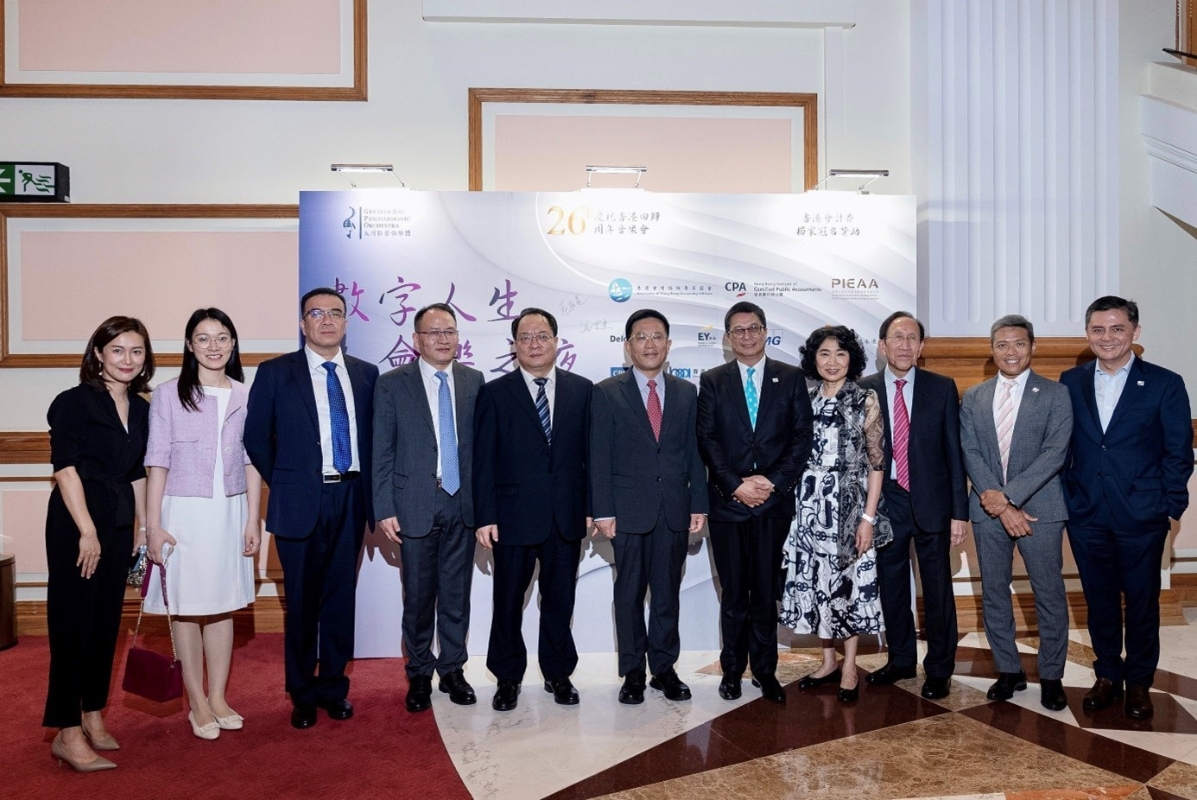 圖一:香港中聯辦秘書長王松苗(中),外交部駐港特派員公署副特派員潘雲東(左五),羅兵咸永道亞太及中國主席趙柏基(左七)以及其他嘉賓合影。 全國政協委員、香港會計諮詢專家協會創會會長、羅兵咸永道亞太及中國主席趙柏基在開場致辭中提到,回歸26年來,香港背靠祖國、聯通世界,憑藉“一國兩制”的制度優勢,經濟社會持續發展。希望該場音樂會,能夠令會計界更加凝心聚力、自強不息,共同為行業的健康成長、為經濟社會的高質量發展,持續貢獻專業力量。