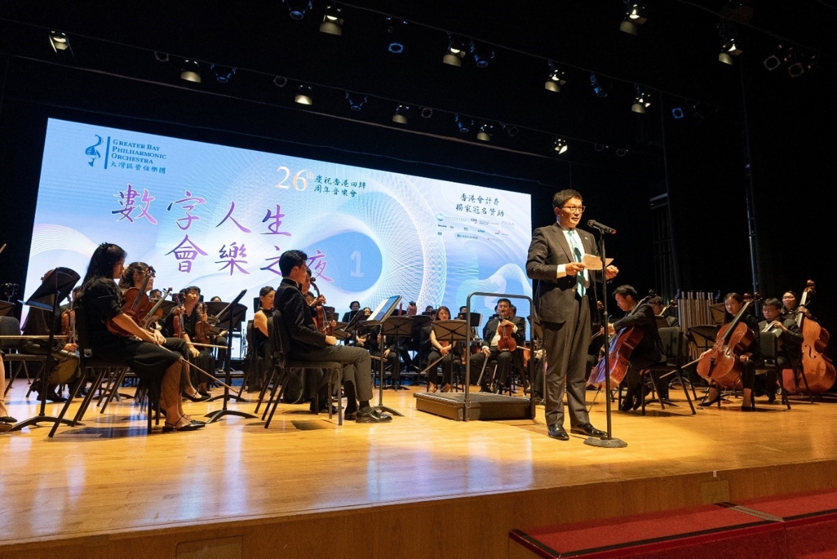 圖二:香港會計諮詢專家協會創會會長、羅兵咸永道亞太及中國主席趙柏基作開場致辭。 是次音樂會由香港會計諮詢專家協會、香港會計師公會及香港上市公司審核師協會聯合主辦,德勤·關黃陳芳會計師行、安永會計師事務所、畢馬威會計師事務所、羅兵咸永道會計師事務所、澳洲會計師公會、香港商界會計師協會及香港華人會計師公會傾力支持。特邀大灣區管弦樂團擔任表演團體,展現大灣區青年音樂家所長的同時,將數字和音符融合一體,以中西方音樂展現不同領域交匯的豐富創意,抒發愛國愛港情懷,弘揚優秀文化,凝聚業界力量,也充分展現了香港作為中西文化交流中心的中華氣象與港風港韻。