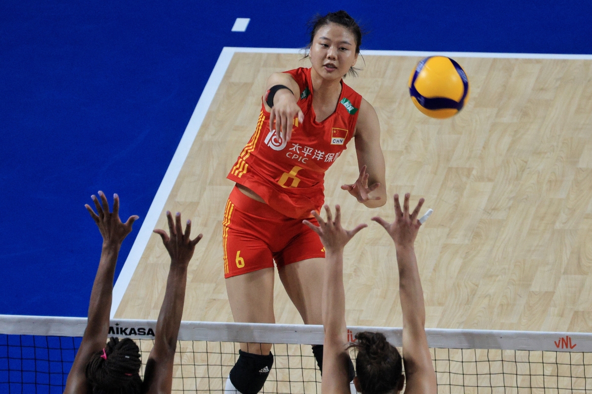 圖為中國女排隊員龔翔宇(紅衣6號)在比賽中扣球