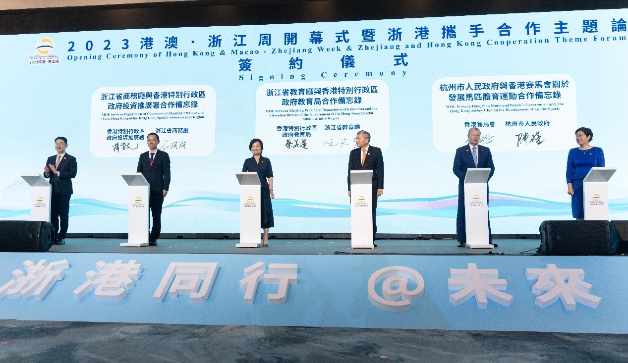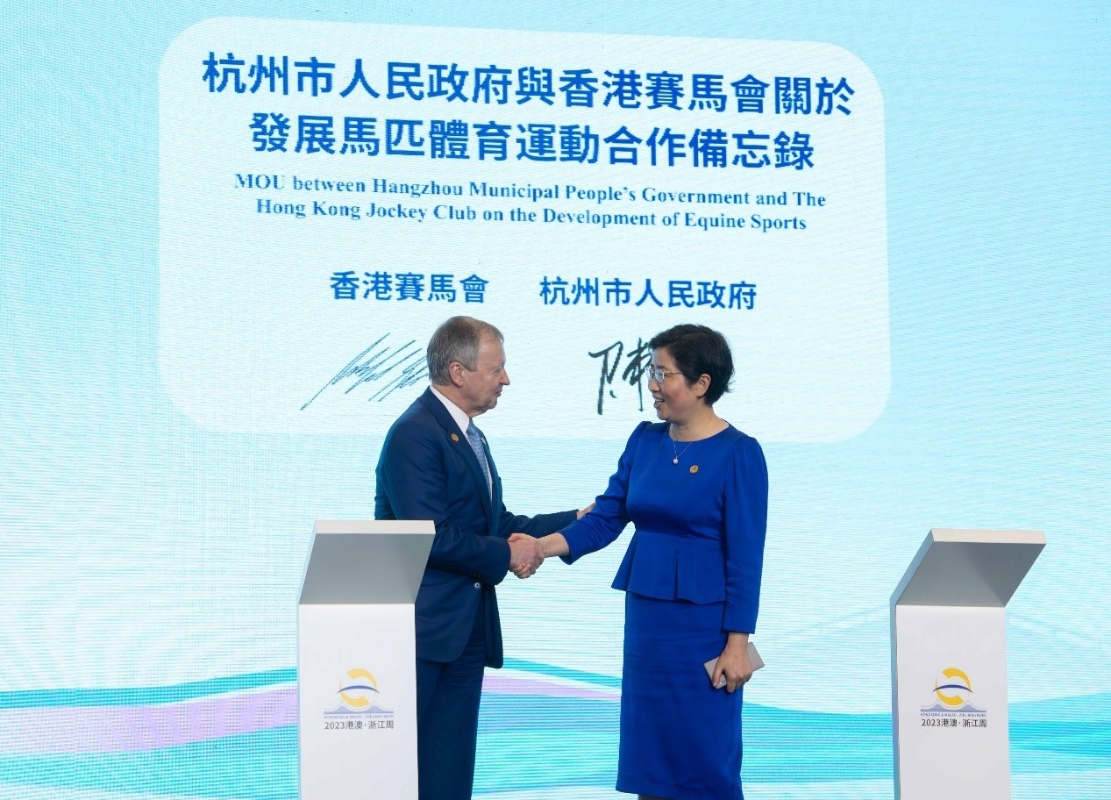 香港新聞網6月26日電 香港賽馬會6月26日與杭州市人民政府在香港簽署合作備忘錄,以進一步加強杭州與香港的合作,共同推動國家馬匹體育運動發展。 合作備忘錄的簽署儀式在“2023港澳∙浙江周開幕式暨浙港攜手合作主題論壇”中進行,并在香港特別行政區行政長官李家超及浙江省省委書記易煉紅的共同見證下,由杭州市政府常務副市長陳瑾與馬會行政總裁應家柏代表雙方簽署有關文件。