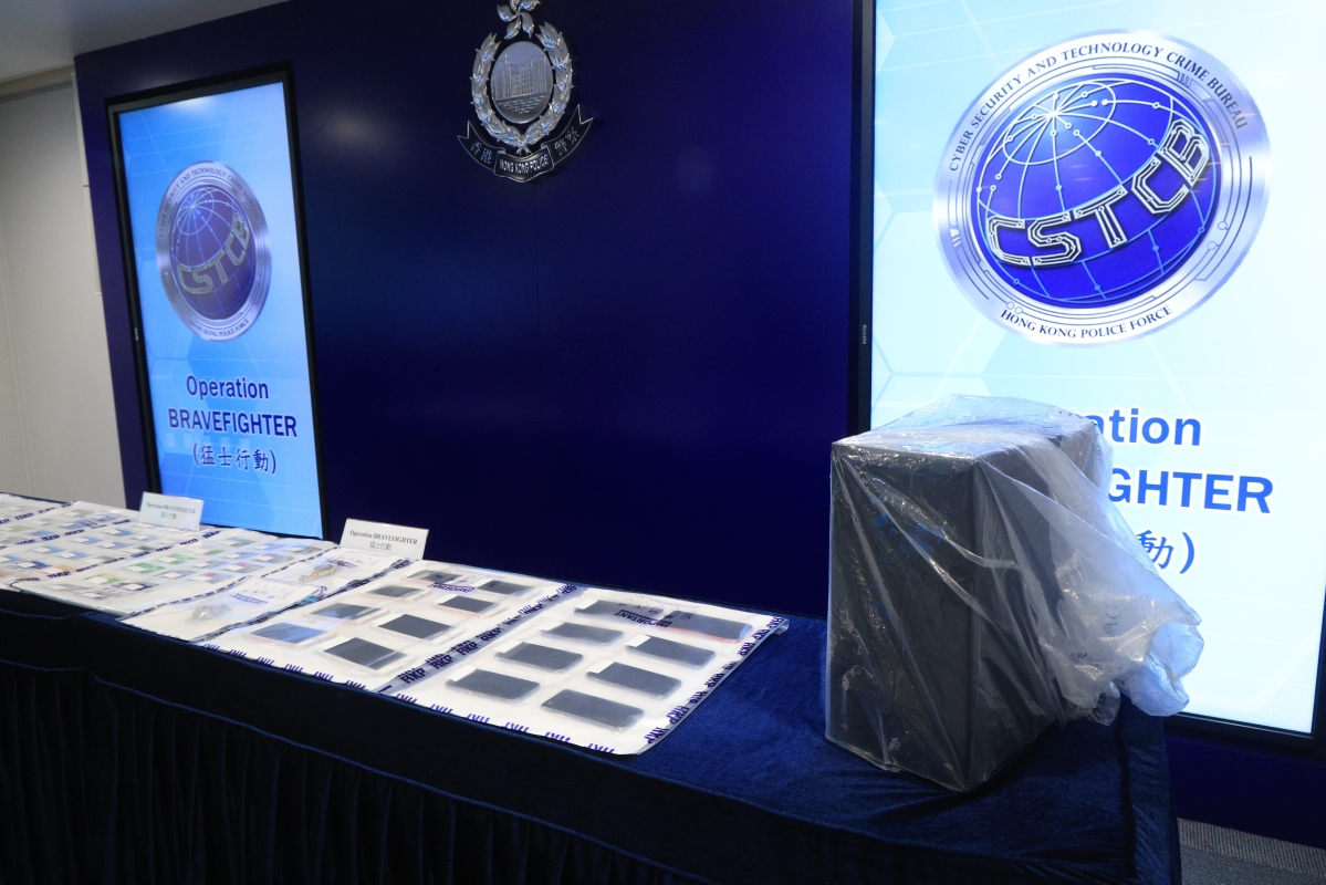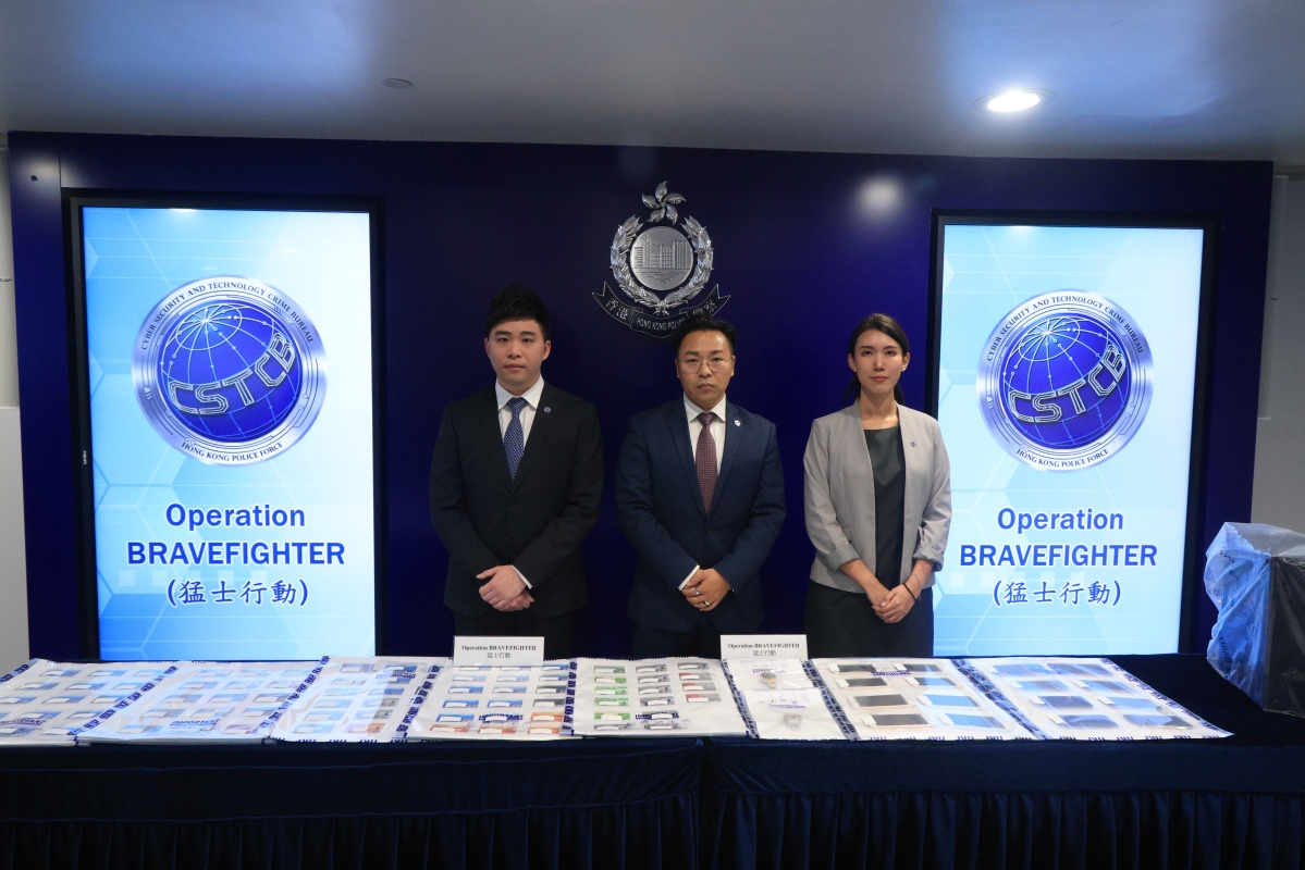 網絡安全及科技罪案調查科警司譚威信、總督察鄭澤仁及高級督察吳柏慧出席記者會。簡介一個打擊“處理已知道或相信為代表從可公訴罪行的得益的財產”(俗稱串謀“洗黑錢”)及其他罪行的拘捕行動。