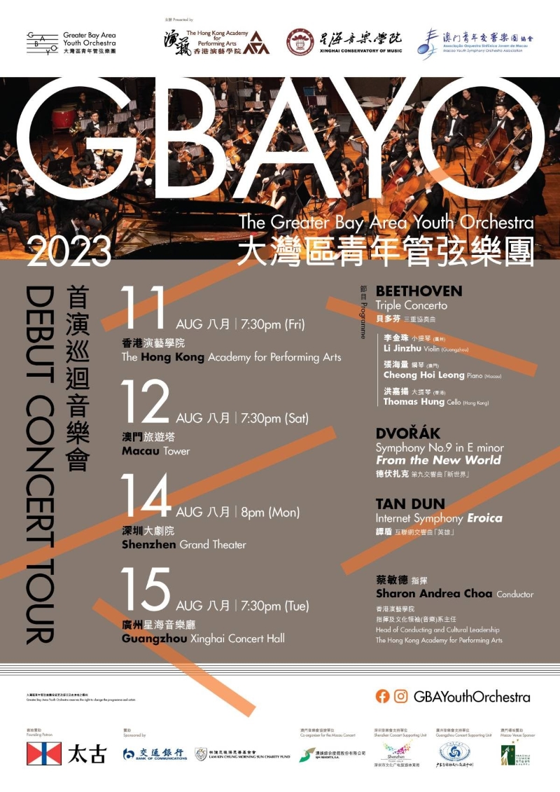 香港新聞網6月30日電 香港演藝學院將於2023年8月11日星期五晚7時30分,在演藝學院香港賽馬會演藝劇院舉行“大灣區青年管弦樂團”首演音樂會。屆時,來自香港演藝學院、星海音樂學院及澳門青年交響樂團協會的大灣區青年音樂家,將匯聚香港演藝學院,攜手呈獻首場“大灣區青年管弦樂團首演巡迴音樂會”。當晚的精選曲目包括貝多芬:三重協奏曲、德沃扎克:第九交響曲及譚盾:互聯網交響曲。