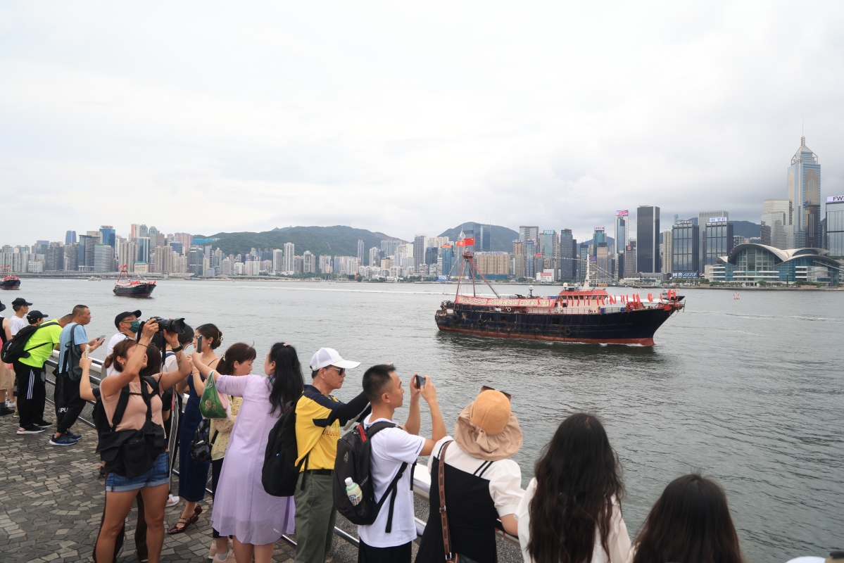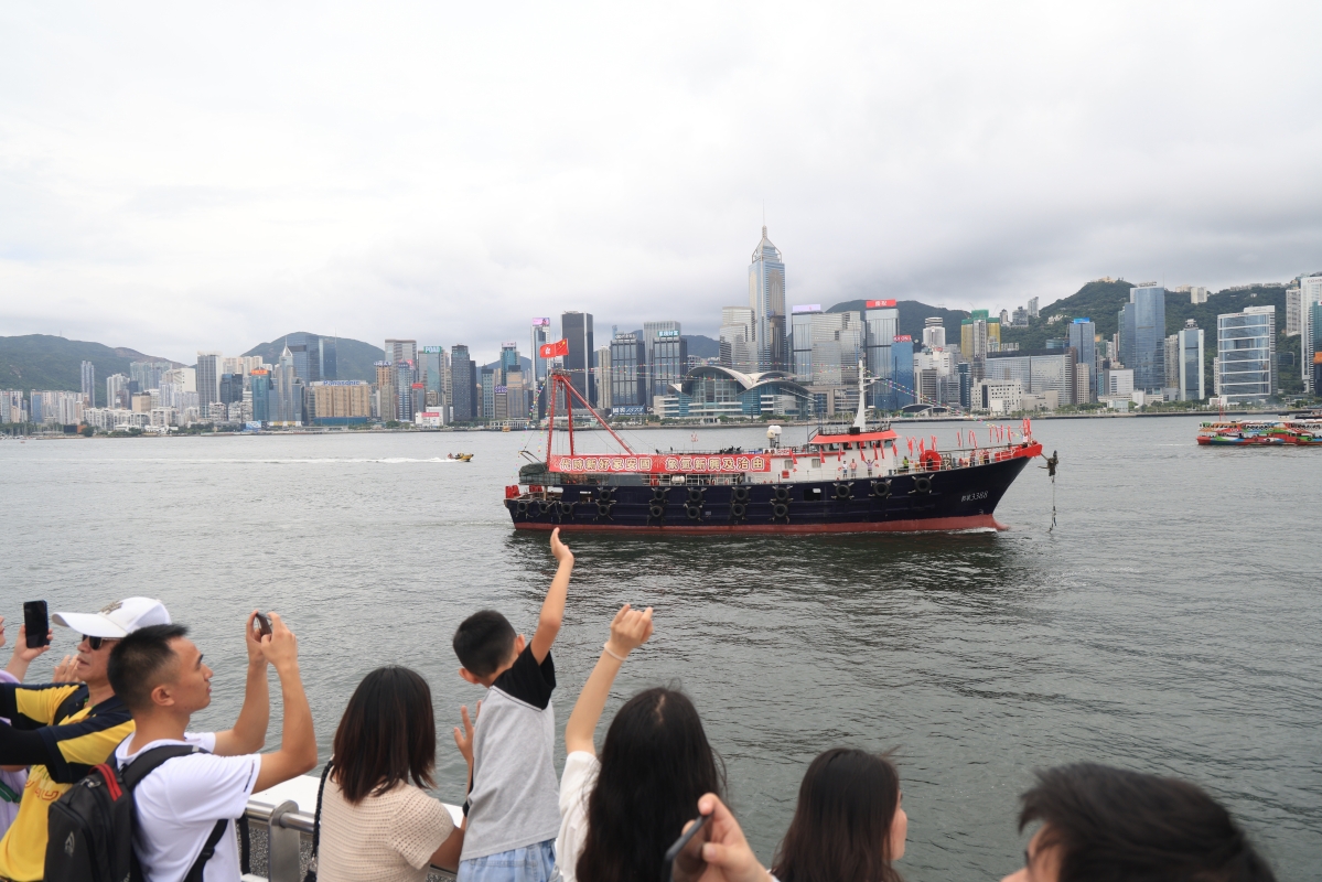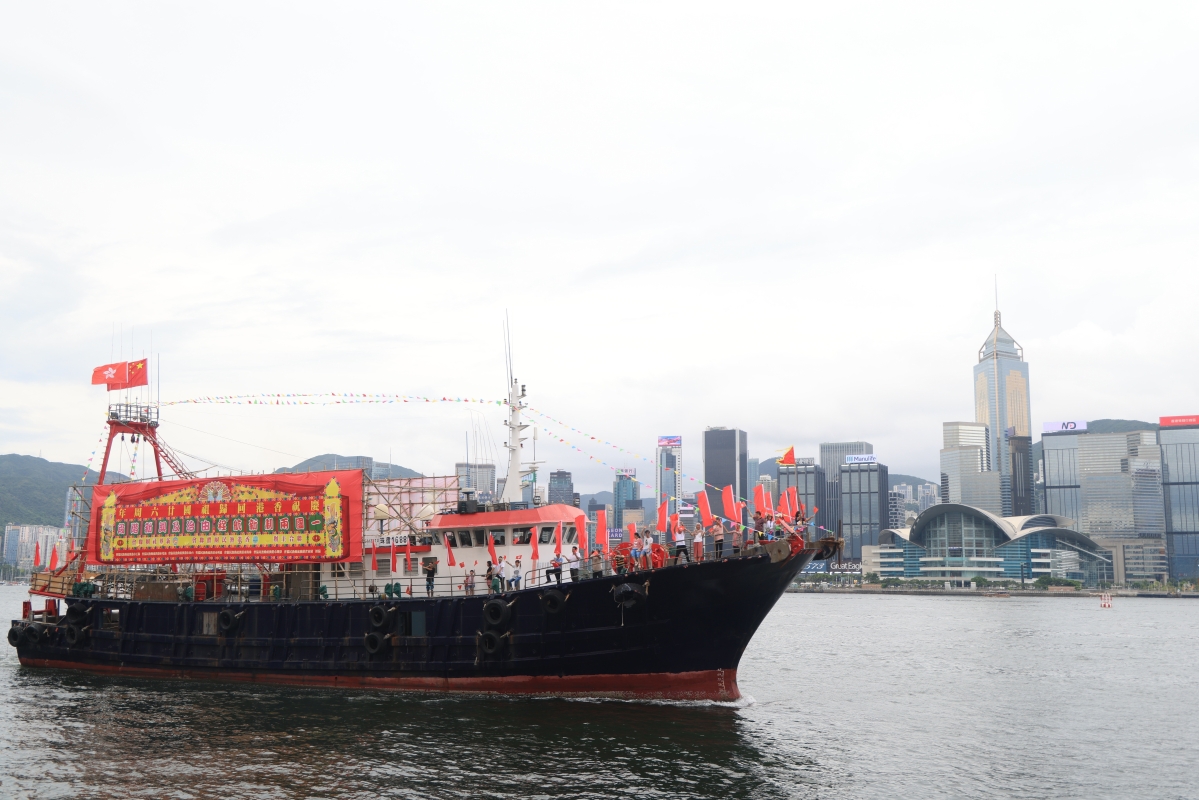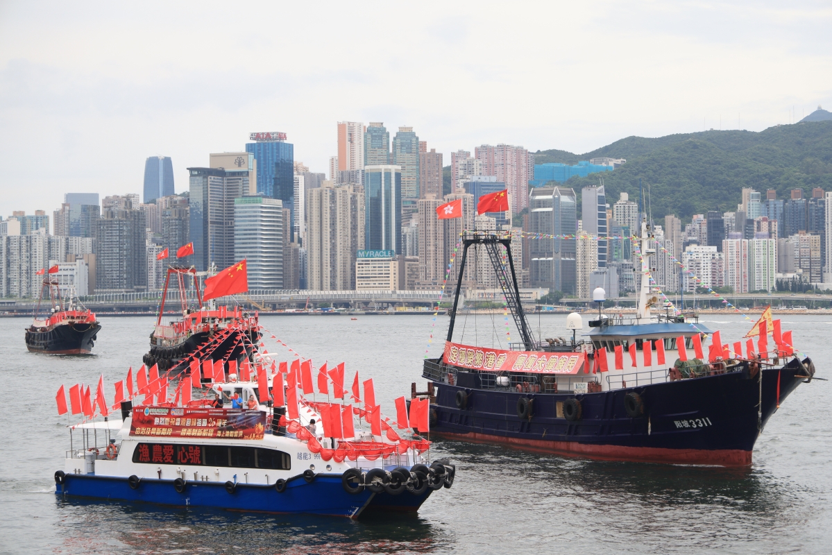 26艘懸掛中華人民共和國國旗、香港區旗和慶祝橫幅的漁船在維多利亞港巡遊