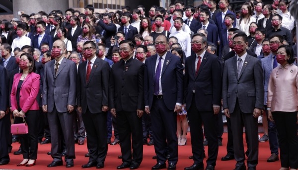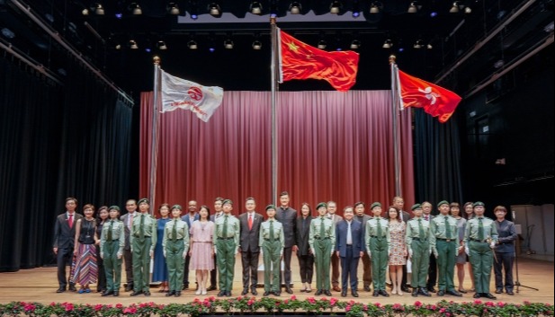 香港新聞網7月1日電 為慶祝香港特區成立26周年,香港教育大學7月1日在大埔校園舉行升旗儀式。 出席儀式的包括教大校董會主席黃友嘉、副主席陳浩華、司庫凌潔心、校董會成員、大學管理層、師生及校友,更邀得一眾本地中小學校長出席,並由教大學生升旗隊負責升掛國旗、區旗及校旗。