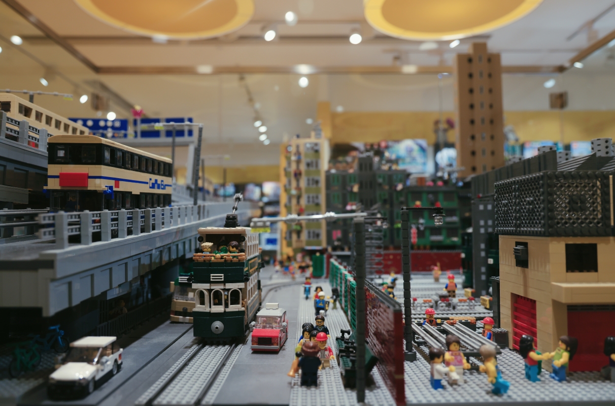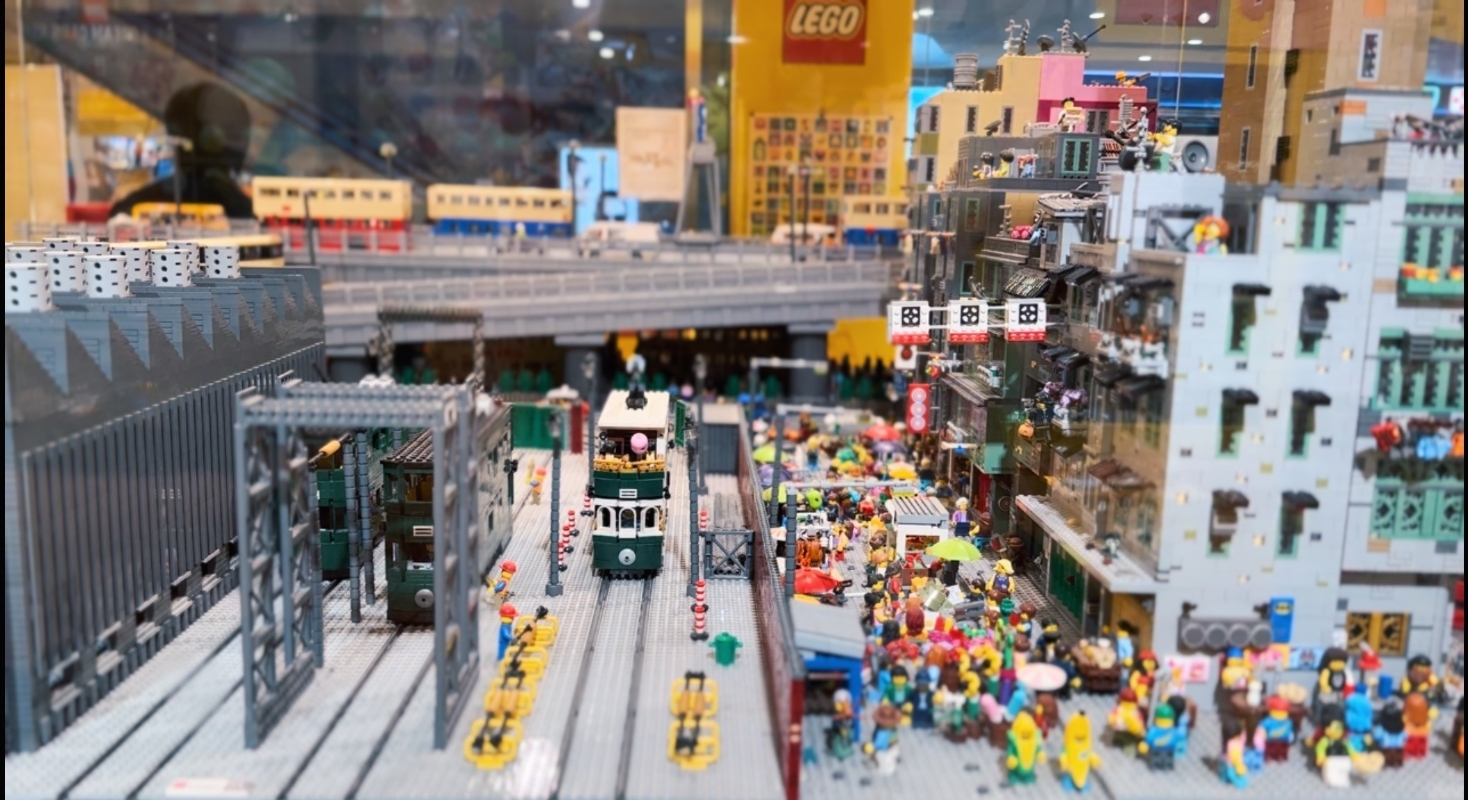 香港銅鑼灣時代廣場樂高店展出“樂高認證專業大師”洪子健作品《香港銅鑼灣霎東街電車廠》。