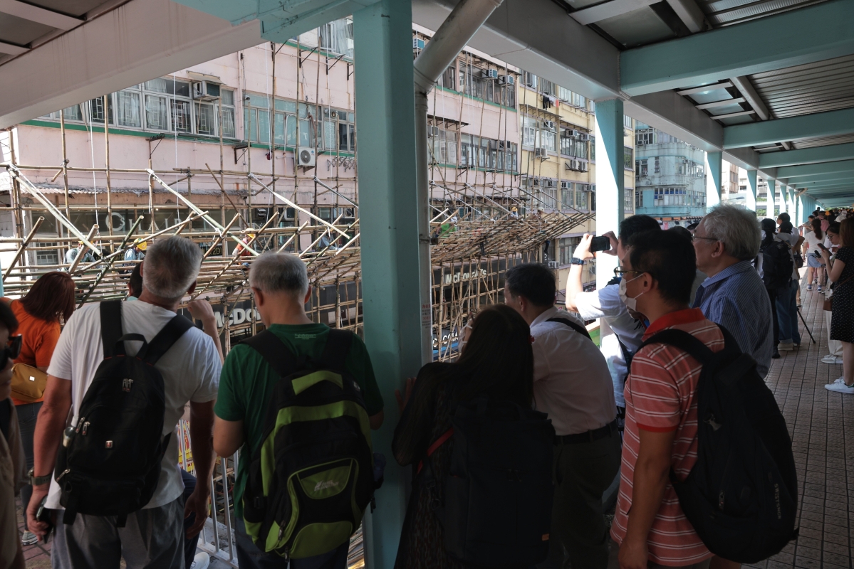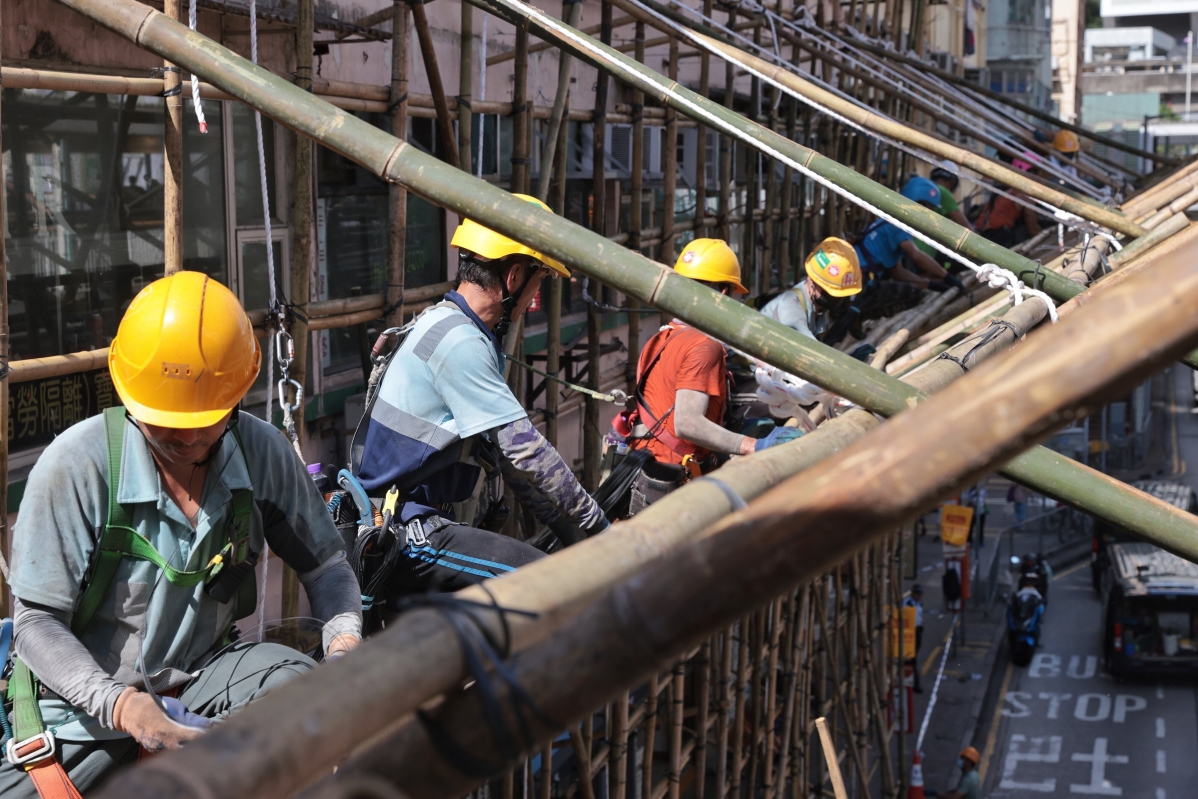 大批工人在寶安大廈進行搭棚工作準備清理