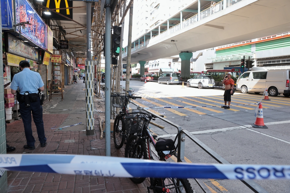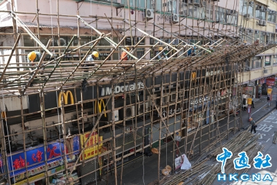 香港新聞網7月5日電(記者謝光磊)7月5日,香港旺角寶安大廈大量石屎剝落,石屎最大有拳頭般大,幸無人受傷,這是寶安大廈4日內第二次石屎剝落。當天下午時,搭棚車到達旺角道,在寶安大廈搭棚緊急清拆並修葺冧石屎範圍。大批工人在寶安大廈進行搭棚工作。警方封鎖現場和旺角道部分行車道。