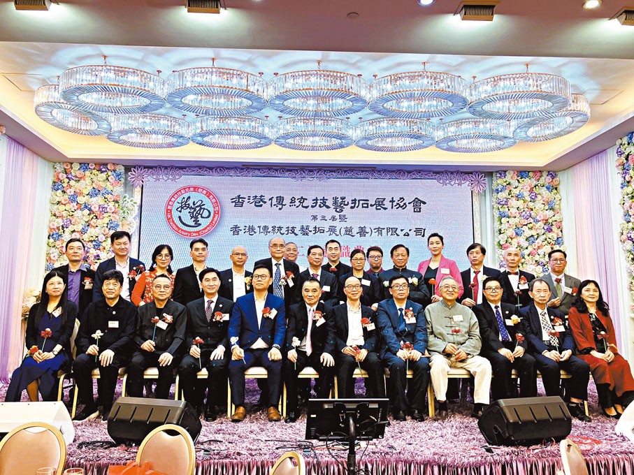 協會首長與主禮嘉賓合影。 協會主席林戈致辭時表示,過去數年在疫情之下,協會亦沒有停止發展步伐,舉辦了13場傳統技藝表演及慈善活動,並走進社區、中小學、安老院舍等,為長者及基層市民送溫,派發抗疫物資。另外協會亦舉辦傳統技藝培訓班,包括葫蘆絲演奏班、剪紙班、麵粉公仔班、四川變臉班等。 港區全國人大代表、立法會議員馬逢國致辭時讚揚,協會匯聚全港傳統技藝人才,發揮所長,開展社區巡演、藝術教育等豐富多彩活動。他又說,協會一路走來付出很大努力,歷程艱辛,大家在增進自己藝術修為的同時,也在傳統技藝文化傳承與發展等方面作出貢獻。