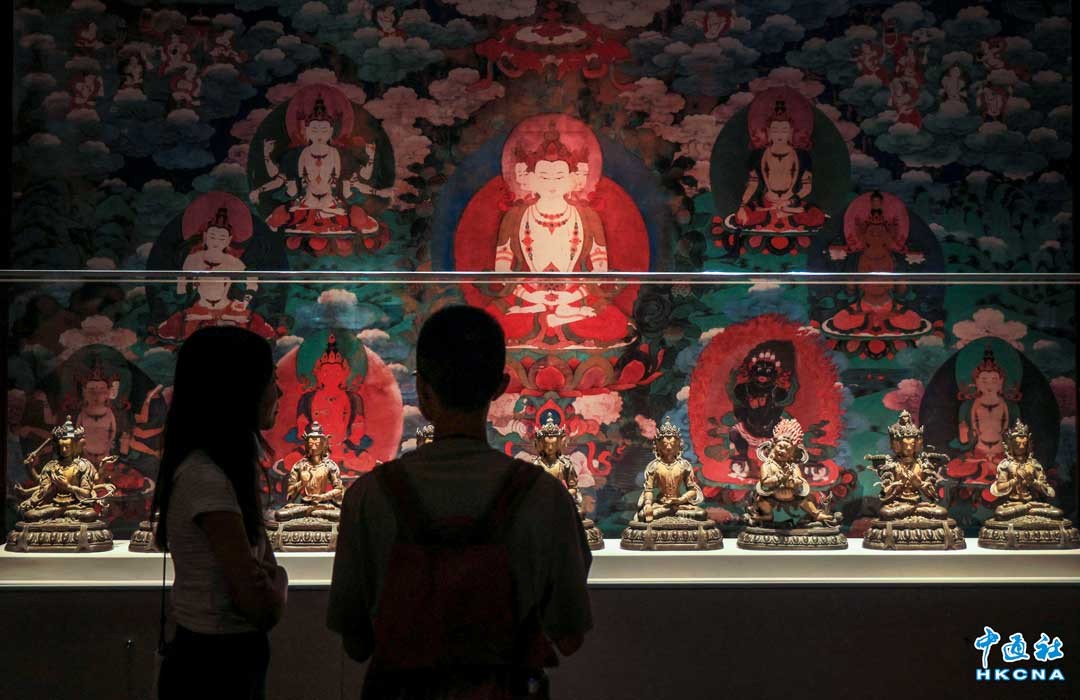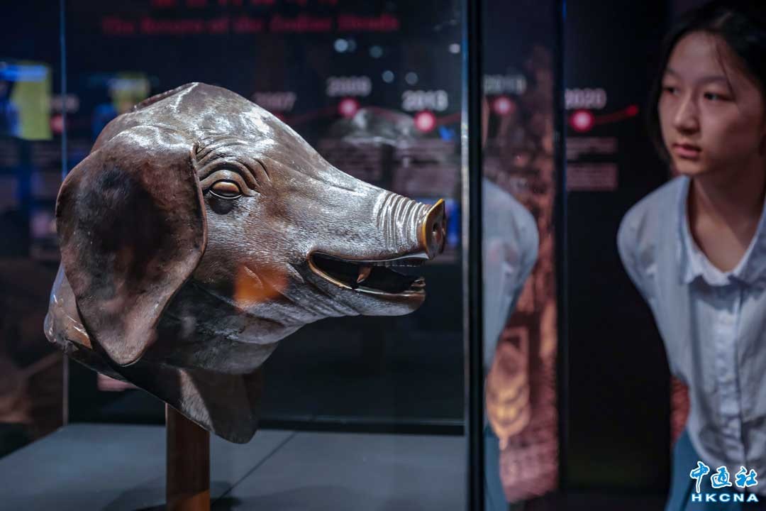7月4日,香港城市大學般哥展覽館推出“盛世聚首 天寶芳華:圓明園獸首暨文物展”,向公眾免費展出圓明園海晏堂中虎、豬、牛、猴四尊獸首銅像原物。圖為市民參觀豬首。 (香港中通社記者 謝光磊攝)