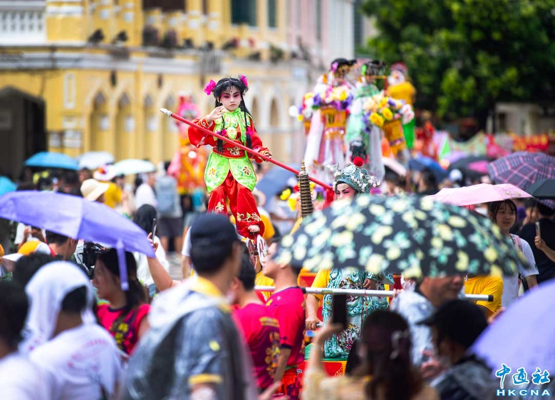 7月4日,澳門大三巴哪吒廟舉辦哪吒飄色巡遊。農曆五月十八日 (5日)是哪吒誕,澳門氣象局在4日下午一度發出黃色暴雨警告,但無礙表演者、圍觀市民及旅客的熱情。巡遊隊伍自大三巴哪吒廟前地出發,途經大三巴街、議事亭前地、花王堂前地等。香港中通社圖片