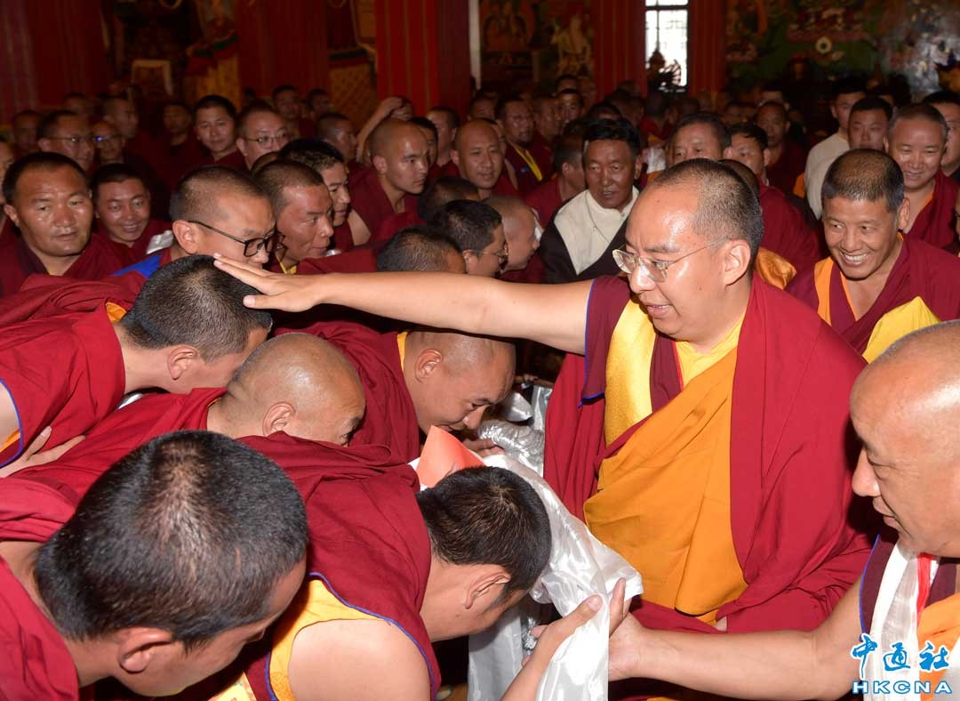 7月3日,班禪在西藏佛學院為僧人摸頂賜福。 7月2日至3日,全國政協常委、中國佛教協會副會長、中國佛協西藏分會會長班禪額爾德尼·確吉傑佈在西藏佛學院為廣大僧尼舉行“十三尊大威德金剛”灌頂儀式。西藏佛學院將現代學院式和傳統經院式相結合,是西藏第一所高層次藏傳佛教綜合性院校,每年向藏傳佛教五大教派招收學員。香港中通社圖片