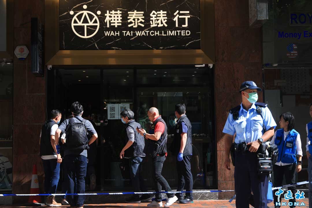 7月6日,香港尖沙咀麼地道一家錶行發生劫案,有人持刀和鐵錘闖入行劫,之後乘坐私家車逃走,店鋪櫥窗遭到損毀。警方正在追緝4名涉案男子,初步估計損失9隻錶,涉及超過港幣100萬元。圖為警方於案發現場調查。 (香港中通社記者 許其皓攝)