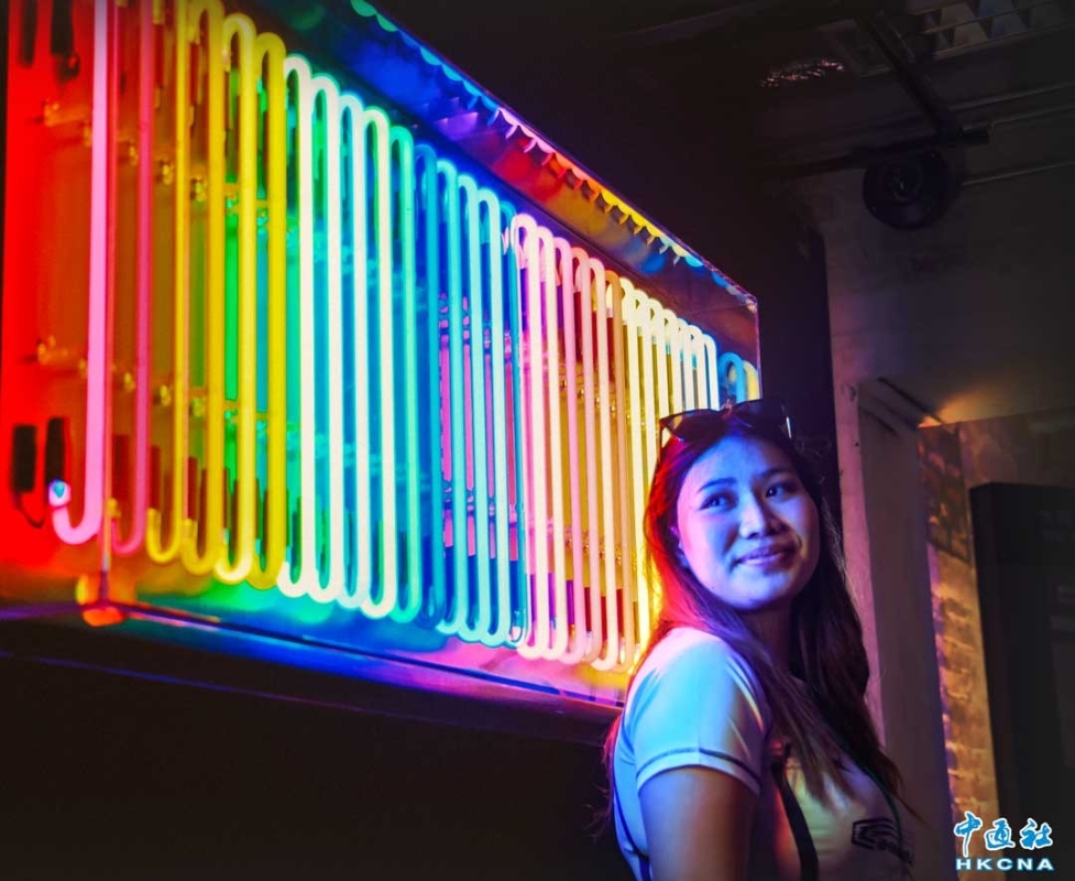 近日,香港中環大館推出《霓續》展覽,展示香港獨特而鮮明的霓虹燈視覺文化形象。觀眾可以欣賞到超過20個霓虹燈招牌,感受其重新綻放出的絢麗光芒;當中不少霓虹招牌更是由霓虹交滙團隊保育下來、重新安裝後首次向公眾展示。 (香港中通社記者 曹文毓攝)