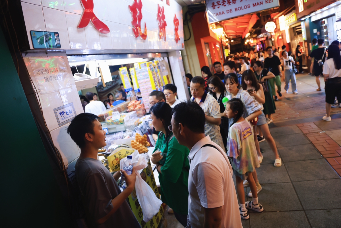 香港新聞網7月13日電(記者 曹文毓)澳門今年上半年入境旅客達1160萬人次。7月首周,酒店入住率已近九成。疫後澳門正開拓更多消閒旅客市場,摘掉“賭城”標籤,打造世界旅遊休閒中心。即便是工作日,旅客仍絡繹不絕,多家商鋪門口大排長龍。遊客人手一碗小吃、一杯凍飲,便在街道旁大快朵頤。 澳門分為澳門半島和氹仔島,一邊有大三巴牌坊、議事亭前地等歷史景點,文化氣息濃厚;另一邊是“東方不夜城”,聚集眾多娛樂場和國際知名酒店,千般嫵媚。 澳門旅遊業近年轉型為世界旅遊休閒中心,不再單一依賴博彩業,將旅遊結合文化、會展等產業,開拓更多消閒旅客市場。