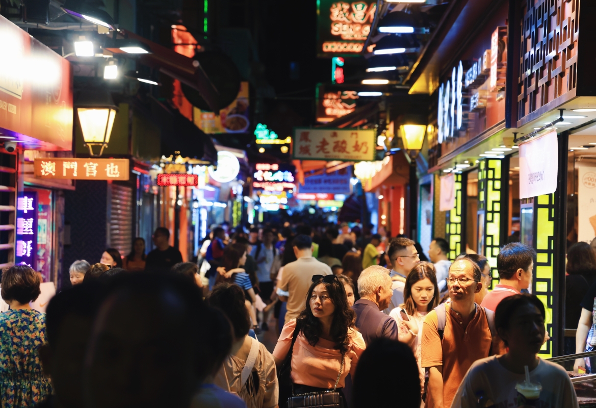 大三巴牌坊的臨近街道,即便是工作日,旅客仍絡繹不絕。