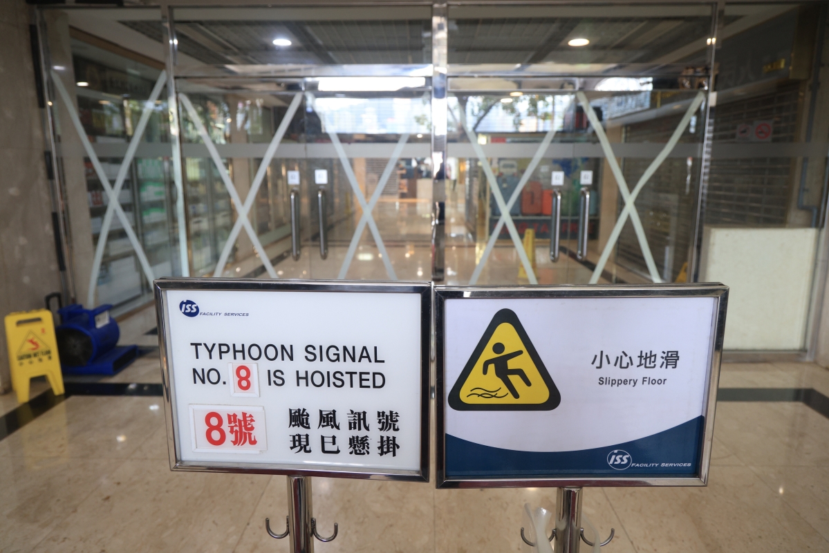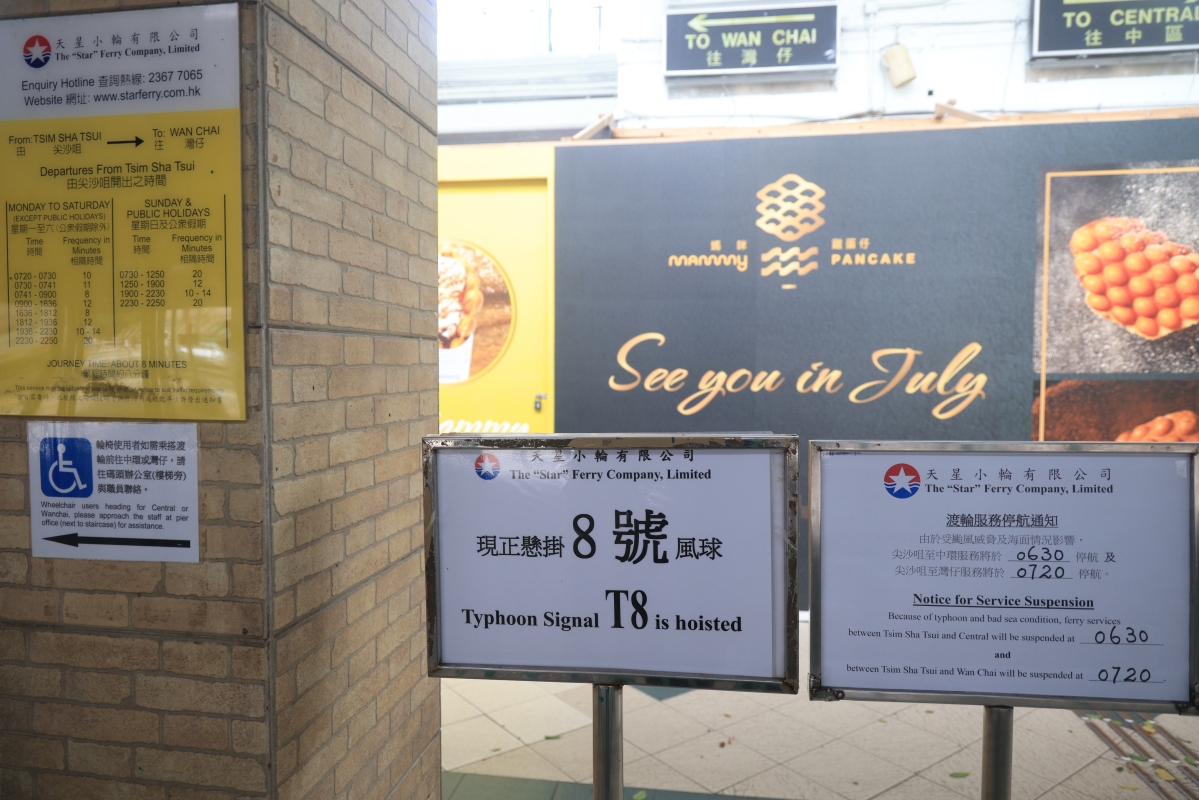 香港新聞網7月17日電(記者 許其皓)7月17日,受到颱風“泰利”影響,香港天文台當日凌晨0時40分發出八號東北烈風或暴風信號。不少商鋪、商場提前做好準備,在玻璃上貼滿膠帶並暫停營業,天星小輪也擺出暫停運營的告示。
