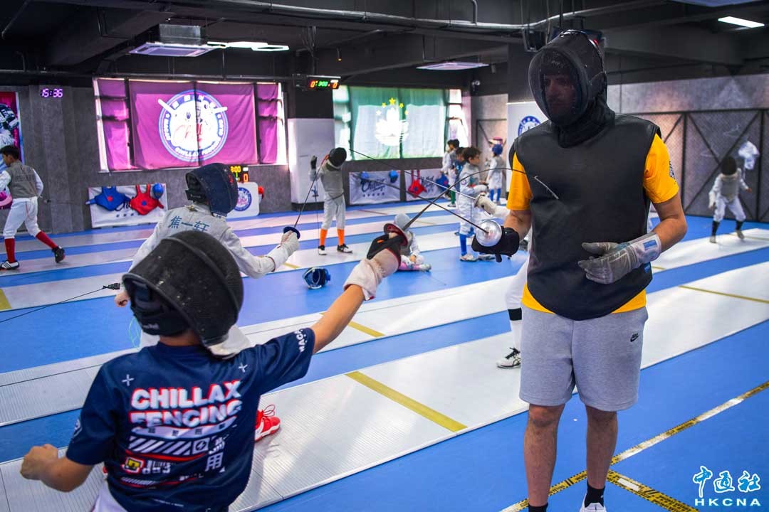 7月13日,奧運花劍冠軍Andrea Cassara(右)在“奧運冠軍花劍交流營”上指導劍手。澳門超酷劍擊會於7月12日至14日舉辦為期三天的“奧運冠軍花劍交流營”,特別邀請了意大利奧運花劍冠軍Andrea Cassara到澳門交流。主辦方冀透過活動為本澳少兒劍擊搭建一個與國際交流的平台,增加劍手之間的技術交流,培養更多有潛力的劍擊選手。 香港中通社圖片