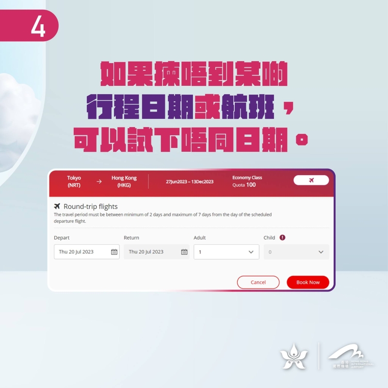 香港新聞網7月24日電 香港航空今日(7月24日)早上10時開始,推出以0元票價購買從香港出發的來回機票(包20公斤寄艙行李)。首輪將送出6,800張機票,旅客須自行承擔相關稅項、附加費及其他收費。市民到指定網站登記搶票前,可參考香港航空公布的“搶機票必知事項”。 香港航空公布以下“搶機票必知事項”: 1、7月24日早上10時起開放。 2、首輪搶機票活動包括5個目的地:大阪、札幌、峇里(巴厘島)、重慶、上海虹橋。當飛機圖標變成“The sale is over”,代表該目的地的0元機票已售罄。 3、若選擇不了想要的航班日期,可嘗試選擇其他日子。留意部分日子並無機票提供,逗留期限須介乎2至7日之間。 4、參與者須年滿12歲。每人每輪最多可贏取一張機票。 5、所有稅項、附加費等需要即時透過網上付款。 香港航空免費往來香港機票:按此登記