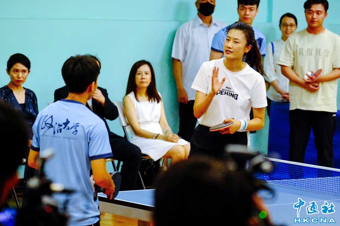 應馬英九文教基金會邀請,北京大學黨委書記郝平7月15日至23日率領北京大學等5所大陸高校36名師生赴台參訪。這是3年多來,大陸高校首次組團赴台交流。 7月17日,大陸高校師生團參訪台灣政治大學並與該校師生進行一場乒乓球友誼賽。丁寧是奪得奧運、世錦賽和世界盃冠軍的“全滿貫”乒乓球好手,學生們都很開心能跟奧運金牌女神近距離接觸。圖為丁寧與政大師生砌磋交流。香港中通社圖片