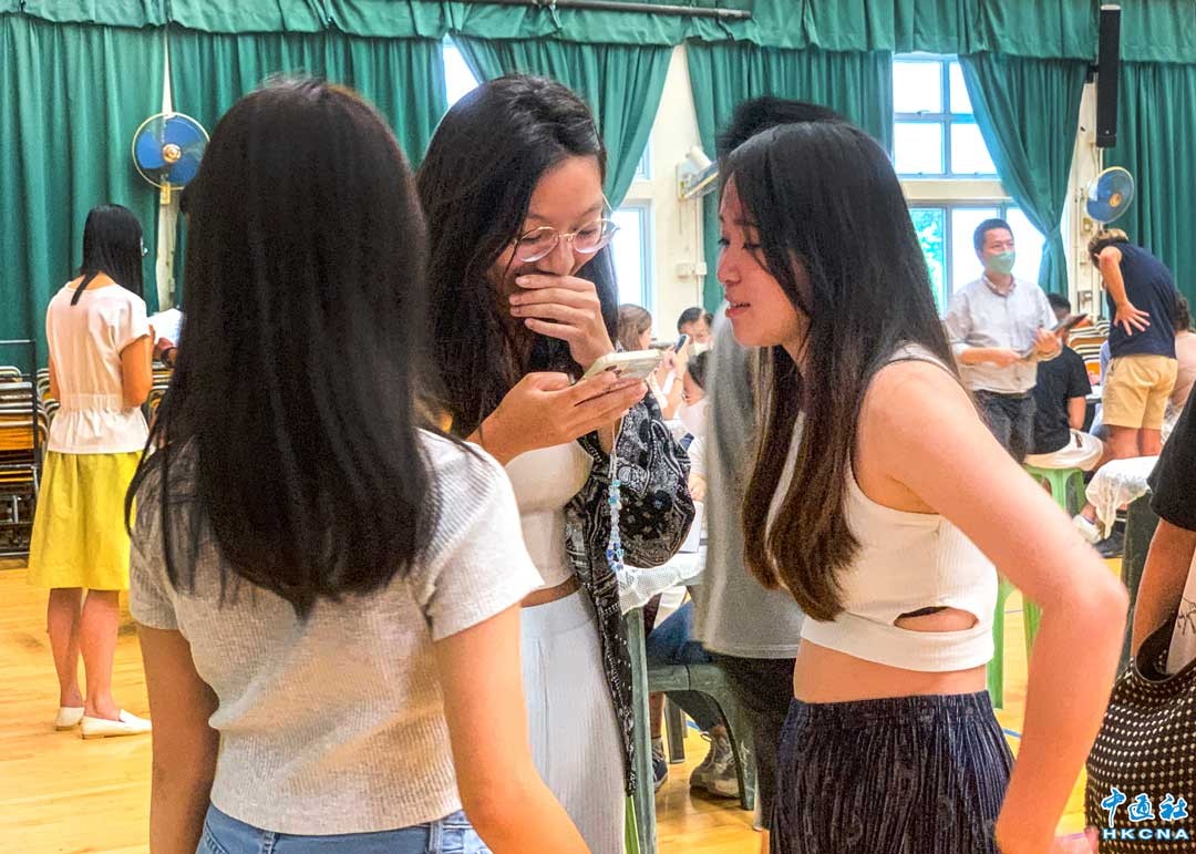 7月19日,香港中學文憑試(HKDSE)放榜。今年文憑試42391名日校考生中,共17450人的成績達到大學一般最低錄取要求,佔日校考生的約42.4%。圖為沙田培英中學學生在討論成績。 (香港中通社記者 徐文峰攝)