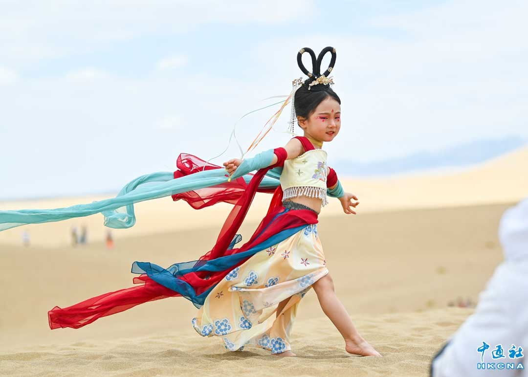 7月21日,甘肅敦煌鳴沙山月牙泉景區內,遊客身著西域服飾進行旅拍。隨著有關敦煌舞的綜藝節目和網絡直播持續走紅,不少遊客前往敦煌景區穿上以飛天服飾為代表的各類服裝進行打卡拍照。以“飛天旅拍”為代表的敦煌元素,為遊客提供了一種獨特的旅行體驗。據了解,今年敦煌湧現出近百家“旅拍店”,除了主打代表敦煌文化的飛天服飾外,還新增了西域公主等具有濃鬱西域風格的服飾。香港中通社圖片