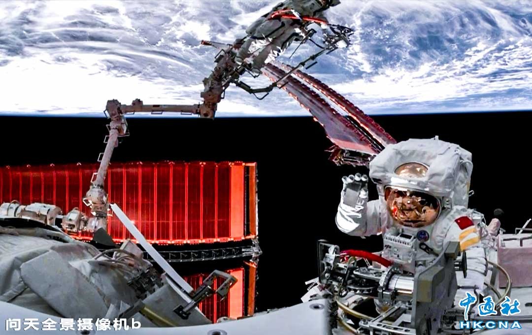7月20日,據中國載人航天工程辦公室消息,當日21時40分,經過約8小時的出艙活動,神舟十六號航天員景海鵬、朱楊柱、桂海潮密切協同,在空間站機械臂支持下,圓滿完成出艙活動全部既定任務,航天員景海鵬、朱楊柱已安全返回空間站問天實驗艙,出艙活動取得圓滿成功。香港中通社圖片