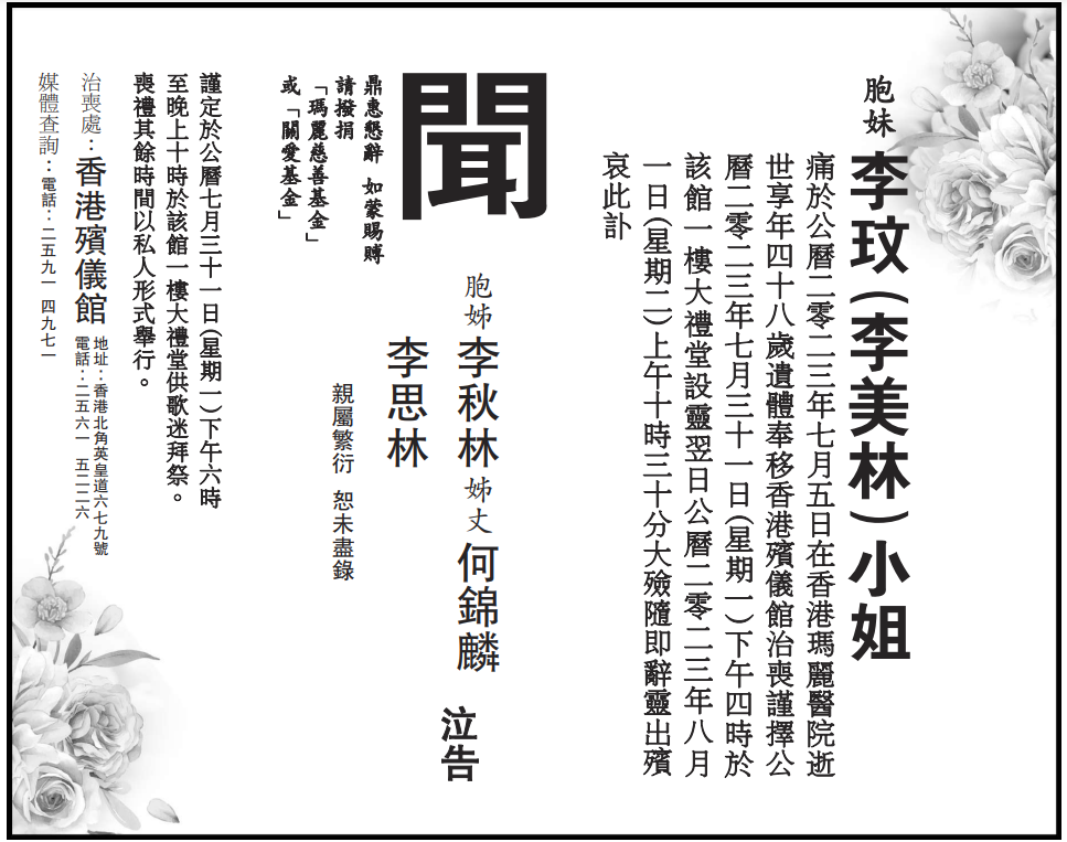 訃聞的署名上,有李玟大姐李秋林、二姐李思林,以及李秋林老公何錦麟。(完) 【編輯:刘春】