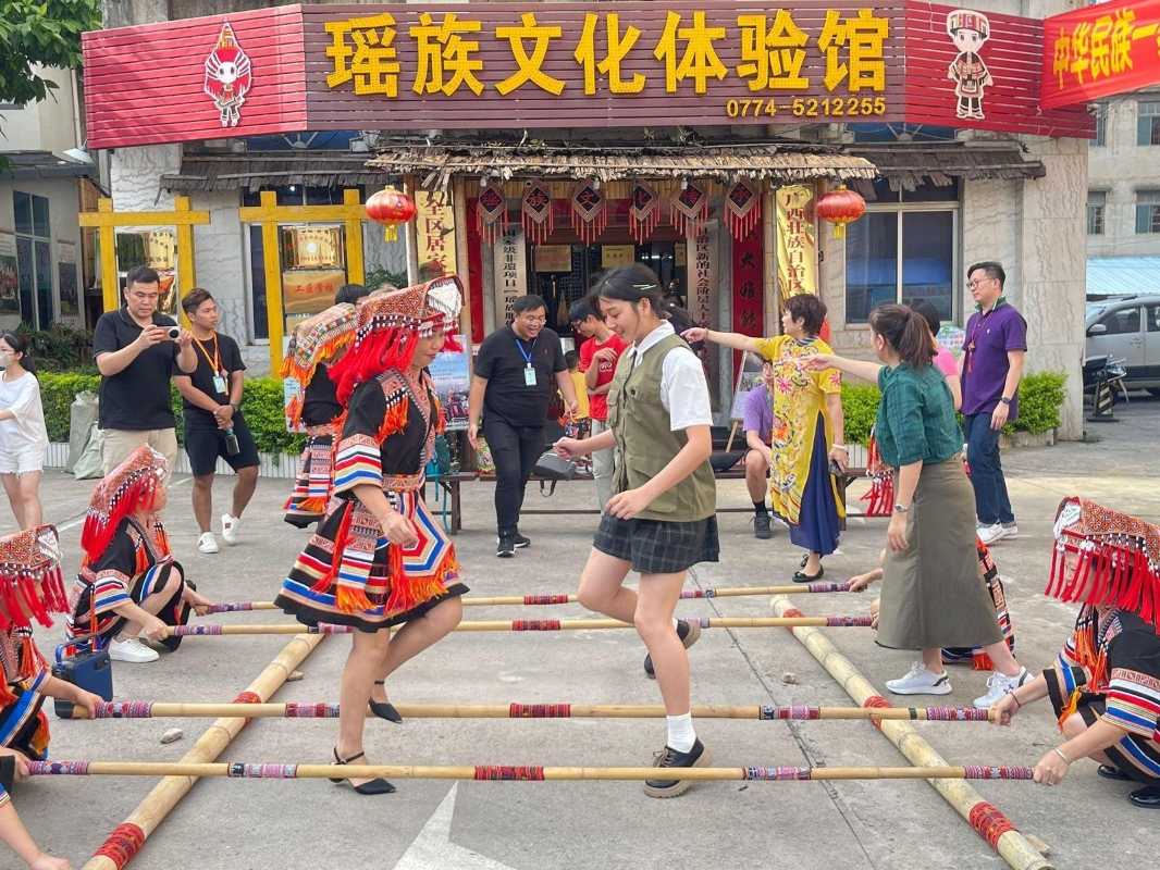 香港新聞網7月28日電 由漁業及環境研究網絡有限公司舉辦“嶺南風情•品讀廣西”青年交流團第二站去到廣西賀州考察,民建聯立法會議員郭玲麗、廣西梧州同鄉會青年義工隊隊長陳永禧帶領,青年感受獨特客家和瑤族文化。當中有不少會談交流、製作體驗和品嚐活動,讓青年用心觀賞和領悟,並身體力行感受當地文化底藴。 行程包括有:參觀客家圍屋、瑤族文化體驗館、楊晉記豆豉廠等,深入認識客家習俗文化,悅耳的民謠和舞蹈表演,以及學習客家語言祝賀語句,並製作客家糍粑和客家釀等美食。此外,團友更體驗瑤族文化攔門儀式、學習瑤繡和竹竿舞,讓青年融入文化氛圍,從而提升國民身分認同感和民族自豪感。