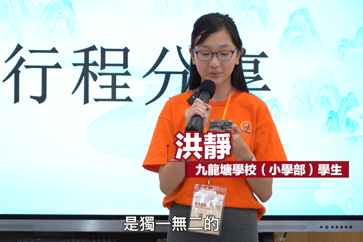 九龍塘學校(小學部)洪靜同學作分享。(點新聞視頻截圖) 來自九龍塘學校(小學部)的洪靜同學表示,嶺南文化是中國南方的文化,是獨一無二的,有其他地區沒有的粵劇、廣彩、磚雕等文化。讀萬卷書,不如行萬里路,這次交流團促進了香港和內地同學的全面交流和深度交融。來自英華書院的梁均溢同學說,這次活動加深了自己對於中國文學、中華文化的認識,希望日後能再有機會進行更多交流,學到更多知識。