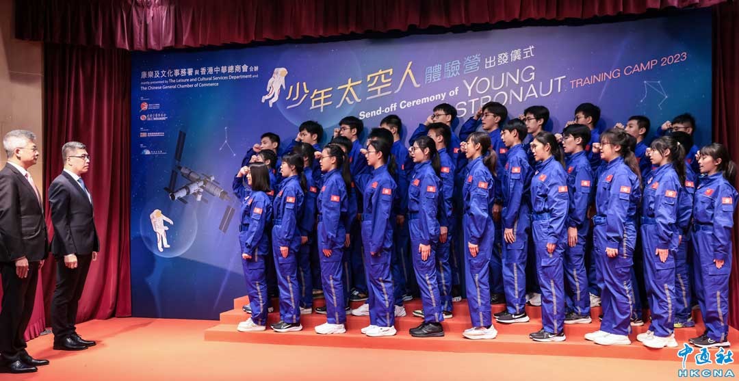 7月25日,“少年太空人體驗營2023”在香港太空館舉行出發儀式,30位香港“少年太空人”即將出發到北京,親身體會國家在航天科技事業的非凡成就。圖為宣誓儀式。 (香港中通社記者 謝光磊攝)