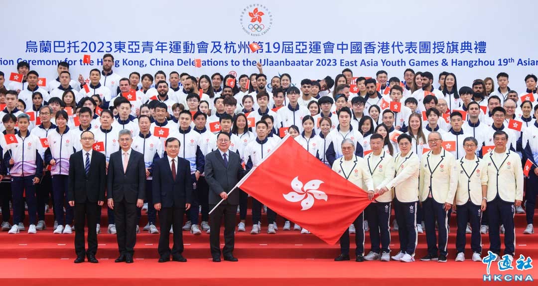 7月25日,烏蘭巴托2023東亞青年運動會及杭州第19屆亞運會中國香港代表團授旗典禮舉行。杭州第19屆亞運會將於9月23日至10月8日舉行,中國香港將派出約930人的代表團出戰,人數是歷年之冠。圖為杭州2023亞運會中國香港代表團授旗典禮。 (香港中通社記者 許其皓攝)
