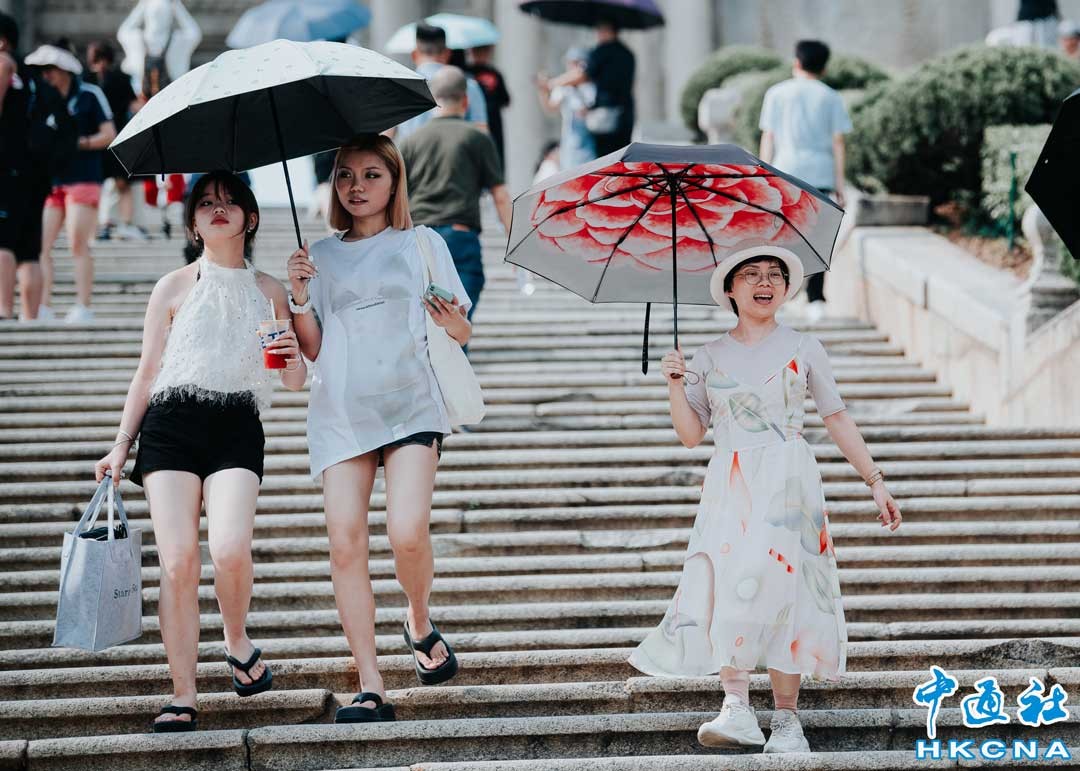 7月26日,旅客在澳門中區觀光。當日,橙色高溫提示生效,澳門多區錄得超過36攝氏度高溫,中區旅客絡繹,行走街頭猶如焗桑拿。香港中通社圖片